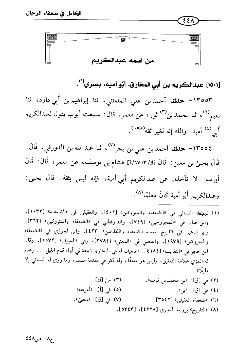 13554 - حَدثنا أحمد بن علي بن بحر، حَدثنا عَبد الله بن الدورقي، قال: قال يَحيى بن مَعين: قال هشام بن يوسف: عن معمر، قال: قال أيوب: لا تأخذن عن عَبد الكريم أبي أمية فإنه ليس بثقة. قال يَحيى: وعَبد الكريم أَبو أمية كان معلما.