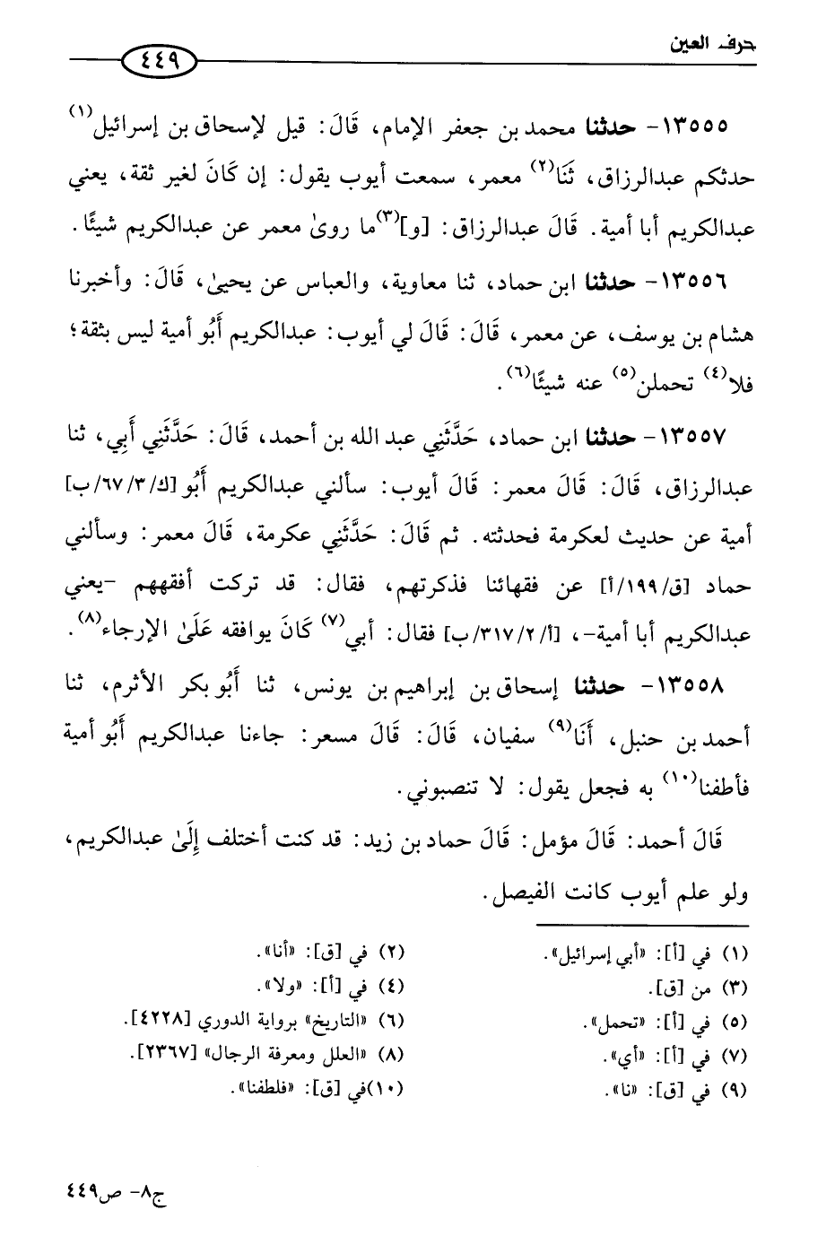 13557 - حَدثنا ابن حماد، حَدَّثني عَبد الله بن أحمد، قال: حَدَّثني أبي، حَدثنا عَبد الرَّزَّاق، قال: قال معمر: قال أيوب: سألني عَبد الكريم أَبو أمية عن حديث لعكرمة فحدثته، ثم قال: حَدَّثني عِكرمَة. قال معمر: وسألني حماد عن فقهائنا فذكرتهم، فقال: قد تركت أفقههم، يعني عَبد الكريم أبا أمية. فقال أبي (1) كان يوافقه على الإرجاء.