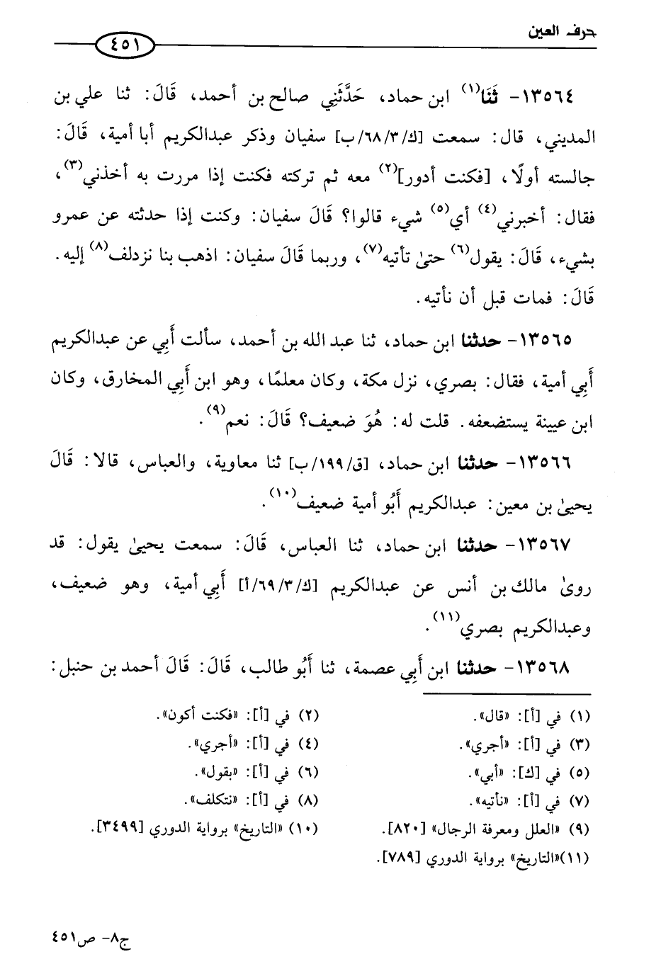 13564 - قال ابن حماد، حَدَّثني صالح بن أحمد، قال: حَدثنا علي بن المديني، قال: سمعتُ سفيان، وذكر عَبد الكريم أبا أمية قال: جالسته أولا، كنت أدور معه ثم تركته، فكنت إذا مررت به أخذني، فقال: أخبرني: أي شيء قالوا؟ قال: سفيان: وكنت إذا حدثته عن عَمرو بشَيءٍ قال: يقول حتى تأتيه، ورُبما قال سفيان: اذهب بنا نزدلف إليه، قال: فمات قبل أن نأتيه.