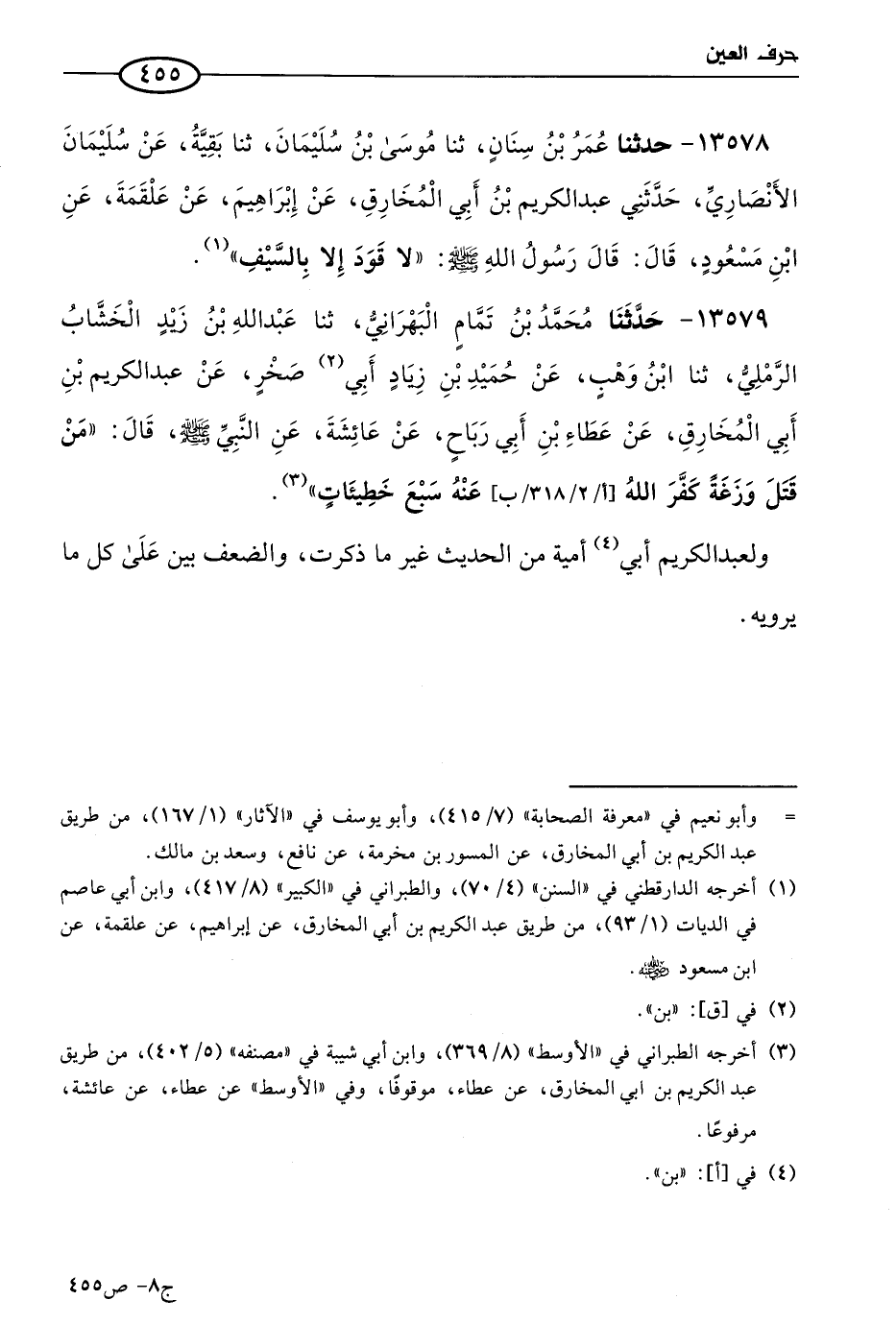 13578 - حَدثنا عُمر بن سنان، حَدثنا موسى بن سليمان، حَدثنا بَقِية، عن سليمان الأنصاري، حَدَّثني عَبد الكريم بن أبي المخارق، عن إبراهيم، عن علقمة، عن ابن مسعود، قال: قال رسول الله صَلى الله عَليه وسَلم: لا قود إلا بالسيف.