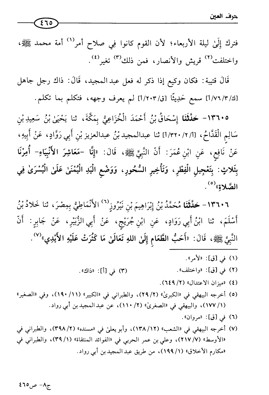 13605 - حَدثنا إسحاق بن أحمد الخزاعي بمكة، حَدثنا يَحيى بن سعيد بن سالم القداح، حَدثنا عَبد المجيد بن عَبد العزيز بن أبي رواد، عن أبيه، عن نافع، عن ابن عُمر؛ أن النبي صَلى الله عَليه وسَلم قال: إنا معاشر الأنبياء أمرنا بثلاث: بتعجيل الفطر، وتأخير السحور، ووضع اليد اليمنى على اليسرى في الصلاة.