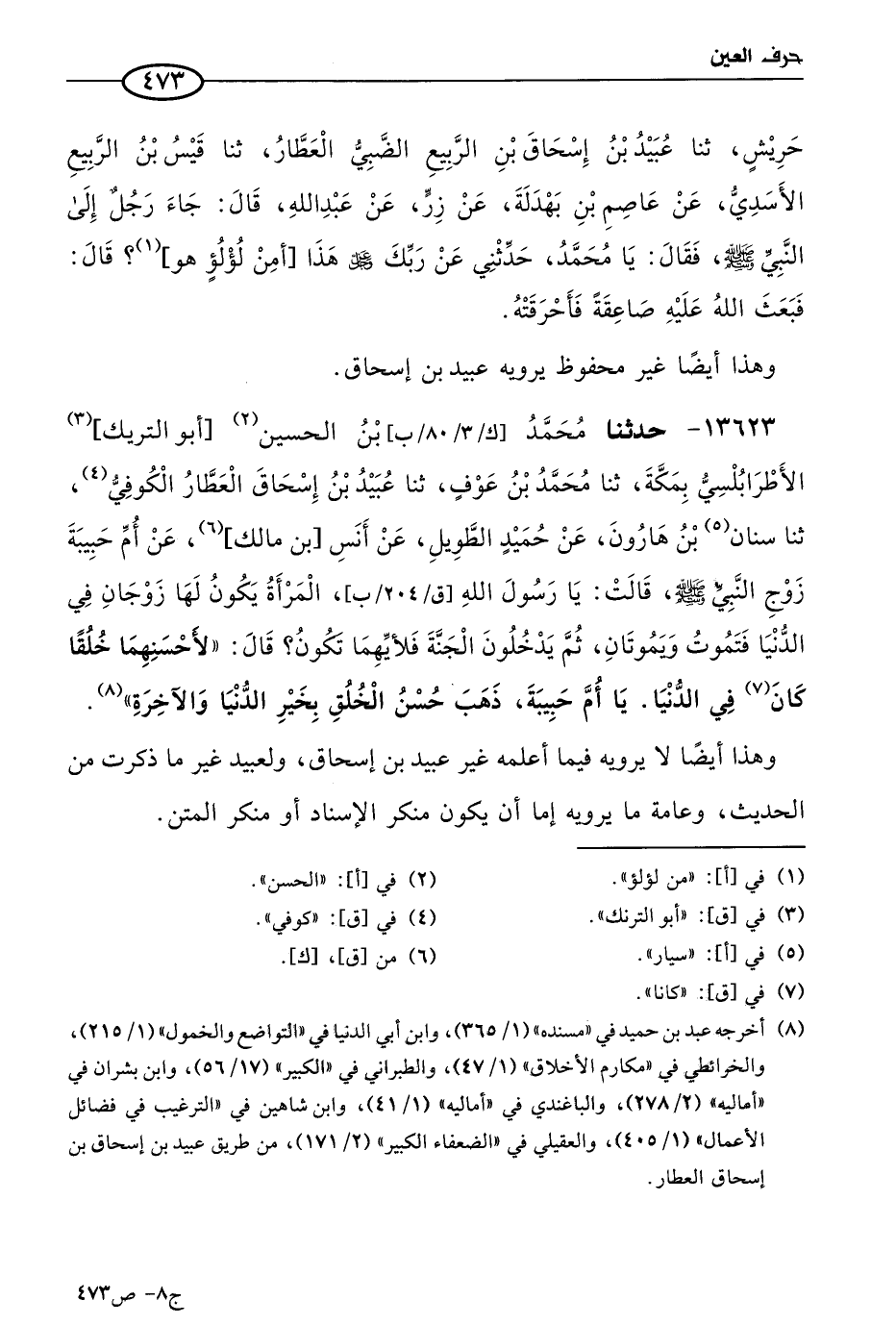 13623 - حَدثنا مُحمد بن الحسين أَبو التريك الأطرابلسي بمكة، حَدثنا مُحمد بن عوف، حَدثنا عُبيد بن إسحاق العطار الكوفي، حَدثنا سنان بن هارون، عن حميد الطويل، عن أَنَس بن مالك، عن أُم حبيبة زوج النبي صَلى الله عَليه وسلم قالت: يا رسول الله، المرأة يكون لها زوجان في الدنيا فتموت ويموتان، ثم يدخلون الجنة فلأيهما تكون؟ قال: لأحسنهما خلقا كانا في الدنيا، يا أم حبيبة ذهب حسن الخلق بخير الدنيا والآخرة.