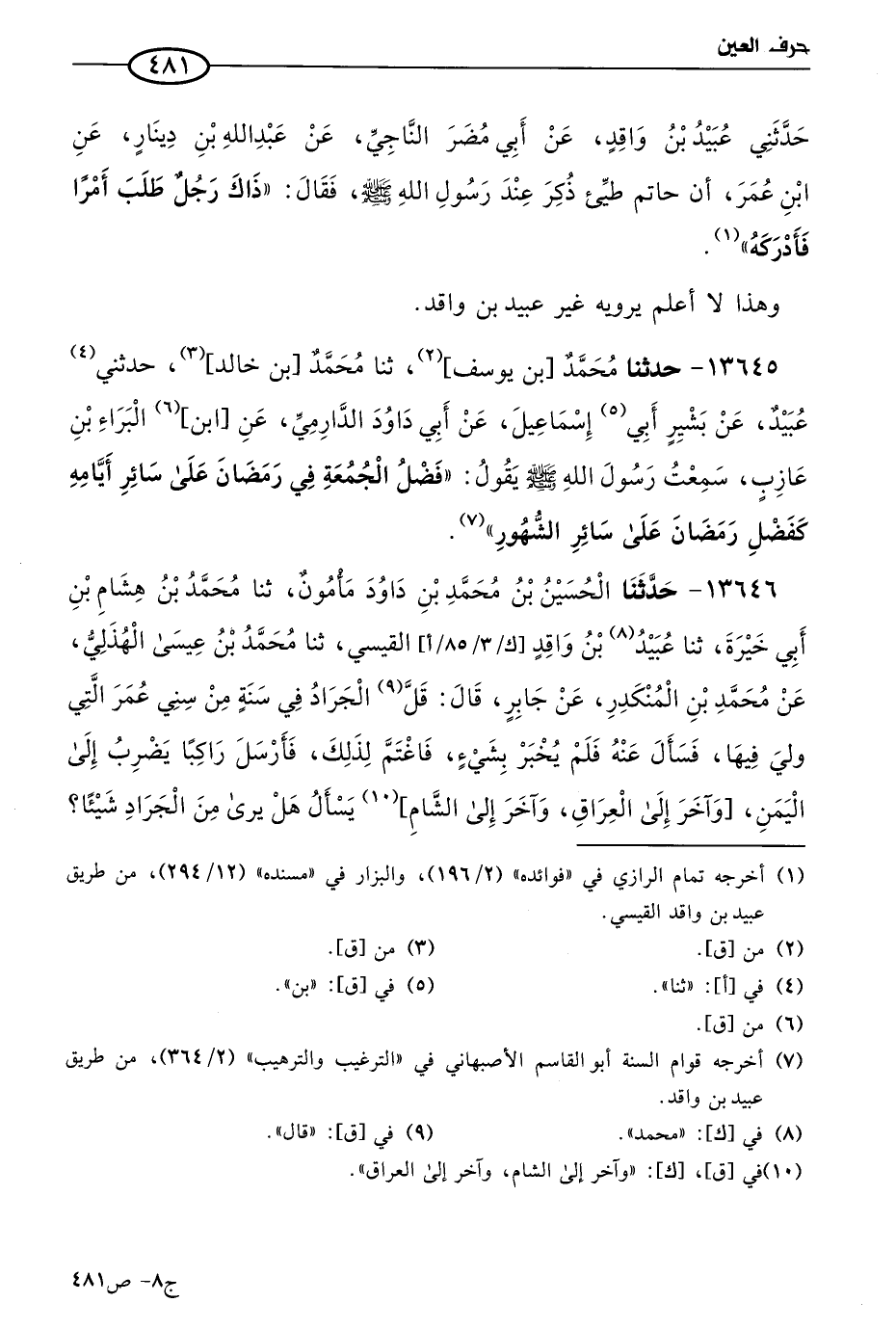 13646 - حَدثنا الحسين بن مُحمد بن داود مأمون، حَدثنا مُحمد بن هشام بن أبي خيرة، حَدثنا عُبيد بن واقد القيسي، حَدثنا مُحمد بن عيسى الهذلي، عن مُحمد بن المنكدر، عن جابر، قال: قلّ الجراد في سنة من سني عُمر التي ولي فيها، فسأل عنه فلم يخبر بشَيءٍ فاغتم لذلك، فأرسل راكبا يضرب إلى اليمن، وآخر إلى العراق، وآخر إلى الشام، يسأل: هل يرى من الجراد شيئا؟ فأتاه الراكب الذي من قبل اليمن بقبضة من جراد، فألقاها بين يديه، فلما رآها كبر ثلاثا، ثم قال: سمعتُ رسول الله صَلى الله عَليه وسَلم يقول: خلق الله ألف أمة، فستمِئَة في البحر، وأربعمِئَة في البر، فأول شيء يهلك من الأمم الجراد، وإذا هلكت تتابعت مثل نظام إذا انقطع سلكه.