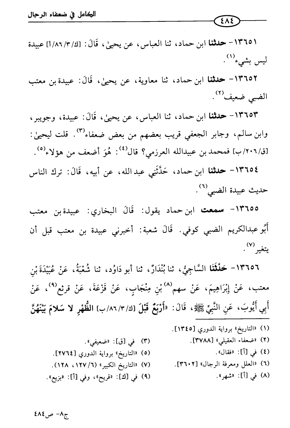 13652 - حَدثنا ابن حماد، حَدثنا معاوية، عن يَحيى، قال: عبيدة بن معتب الضبي ضعيف.
