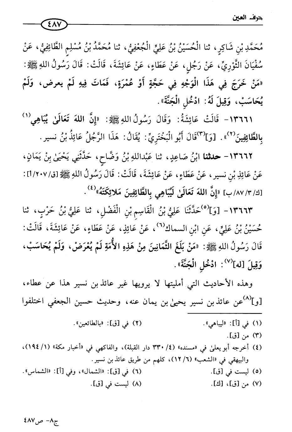 13662 - حَدثنا ابن صاعد، حَدثنا عَبد الله بن وضاح، حَدَّثني يَحيى بن يمان، عن عَائِذ بن نُسَير، عن عَطاء، عن عائشة قالت: قال رسول الله صَلى الله عَليه وسلم: إن الله تعالى ليباهي بالطائفين ملائكته.