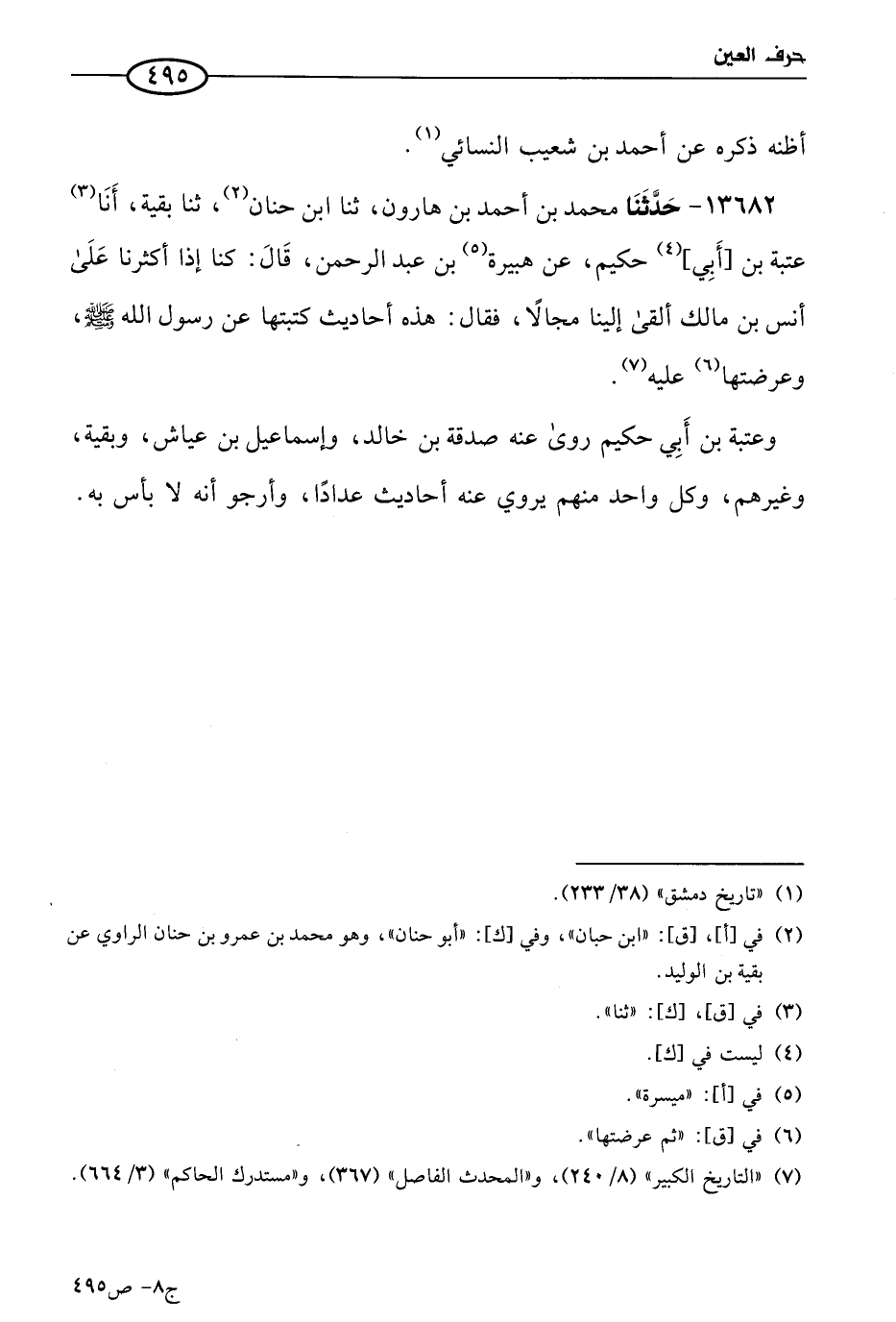 13682 - حَدثنا مُحمد بن أحمد بن هارون، حَدثنا ابن حنان، حَدثنا بَقِيَة، أخبرنا عتبة بن أبي حكيم، عن هبيرة بن عَبد الرحمن قال: كُنا إذا أكثرنا على أنس بن مالك ألقى إلينا مجالا، فقال: هذه أحاديث كتبتها عن رسول الله صَلى الله عَليه وسَلم وعرضتها عليه.