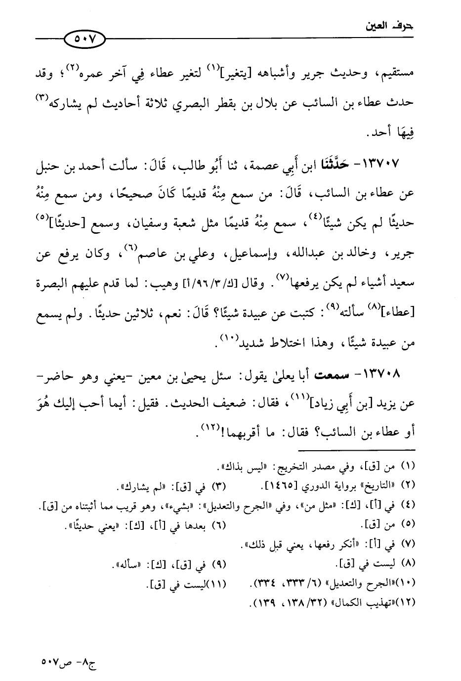 13707 - حَدثنا ابن أبي عصمة، حَدثنا أَبو طالب، قال: سَألتُ أحمد بن حنبل، عن عطاء بن السائب، قال: من سمع منه قديما كان صحيحا، ومن سمع منه حديثا لم يكن شيئا، سمع منه قديما مثل شُعبَة وسفيان. وسمع حديثًا: جرير، وخالد بن عَبد الله، وإسماعيل، وعلي بن عاصم، وكان يرفع عن سعيد أشياء لم يكن يرفعها، وقال وهيب: لما قدم عليهم البصرة عطاء سألته: كتبت عن عبيدة شيئا؟ قال: نَعم، ثلاثين حديثًا، ولم يسمع من عبيدة شيئا، وهذا اختلاط شديد.