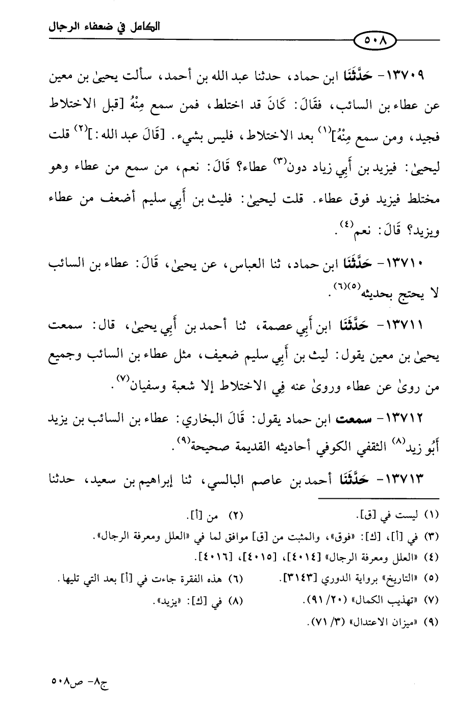 13709 - حَدثنا ابن حماد، حَدثنا عَبد الله بن أحمد، سألتُ يَحيى بن مَعين عن عطاء بن السائب، قال: كان قد اختلط، فمن سمع منه قبل الاختلاط فجيد، ومن سمع منه بعد الاختلاط فليس بشَيءٍ. قال عَبد الله: فقلت ليحيى: فيزيد بن أبي زياد، دون عطاء؟ قال: نَعم، من سمع من عطاء وهو مختلط، فيزيد فوق عطاء، قلت ليحيى: فلَيث بن أَبي سُلَيم، أضعف من عطاء ويزيد؟ قال: نَعم.