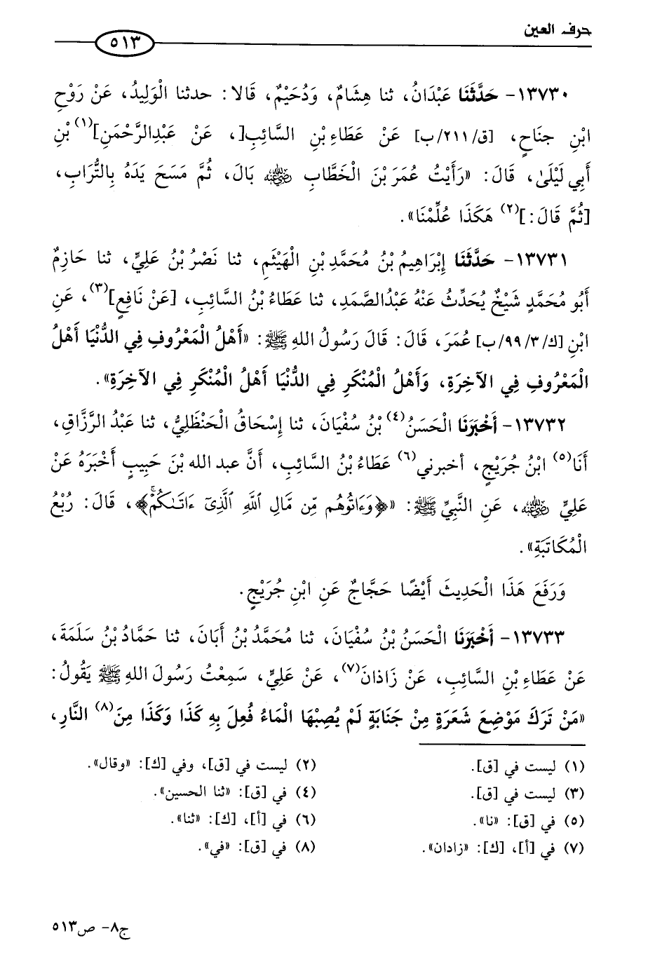 13730 - حَدثنا عبدان، حَدثنا هشام، ودحيم، قالا: حَدثنا الوليد، عن روح بن جناح، عن عطاء بن السائب، عن عَبد الرحمن بن أبي ليلى، قال: رأيتُ عُمر بن الخطاب رضي الله عنه، بال، ثم مسح يده بالتراب، ثم قال: هكذا عُلمنا.