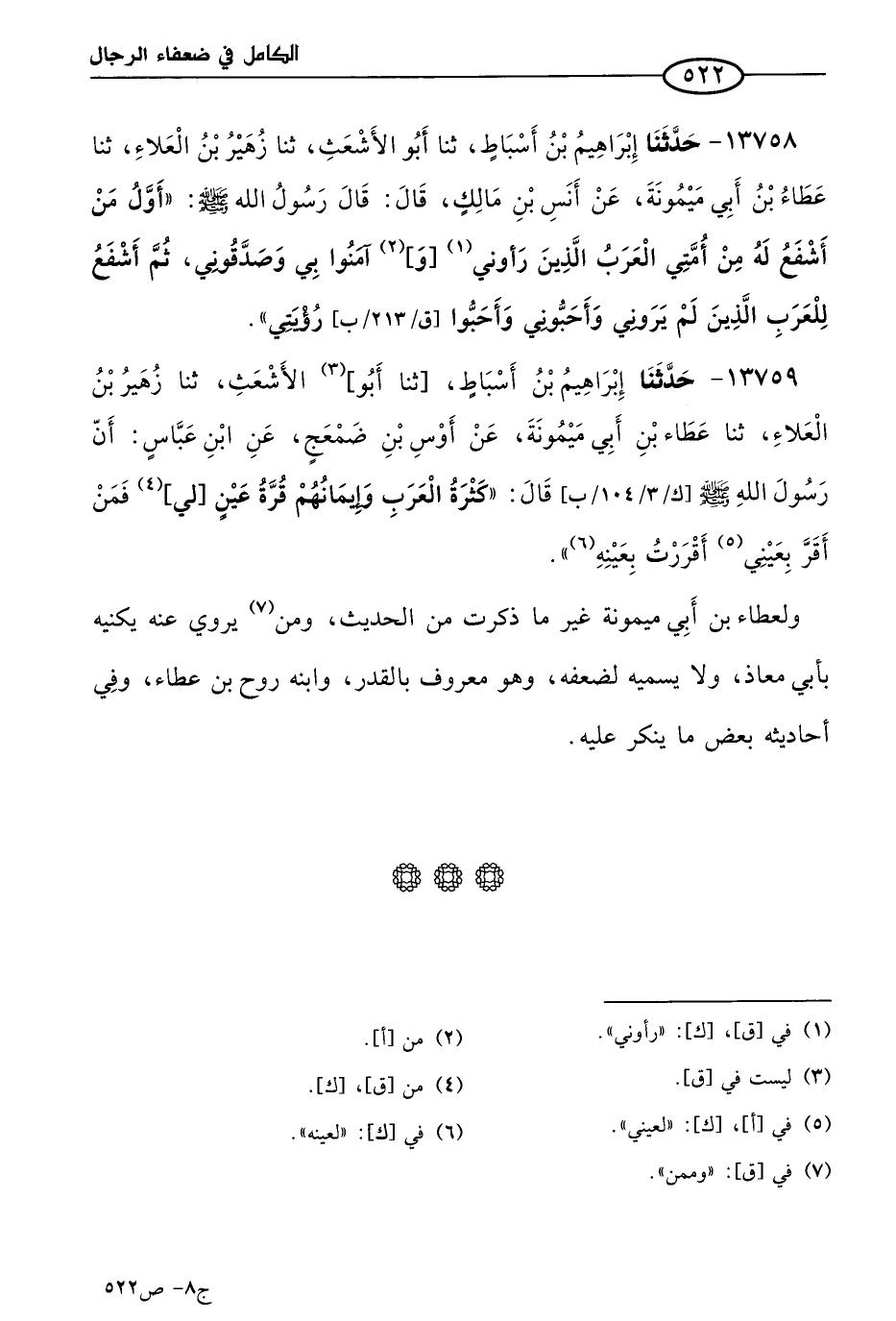13758 - حَدثنا إبراهيم بن أسباط، حَدثنا أَبو الأشعث، حَدثنا زهير بن العلاء، حَدثنا عطاء بن أبي ميمونة، عن أَنَس بن مالك، قال: قال رسول الله صَلى الله عَليه وسَلم: أول من أشفع له من أُمَّتِي العرب الذين رأوني وآمنوا بي وصدقوني، ثم أشفع للعرب الذين لم يروني وأحبوني وأحبوا رؤيتي.