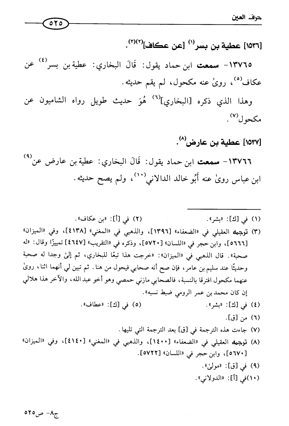 13765 - سمعتُ ابن حماد يقول: قال البُخاري: عطية بن بسر عن عكاف، روي عن مكحول، لم يقم حديثه.