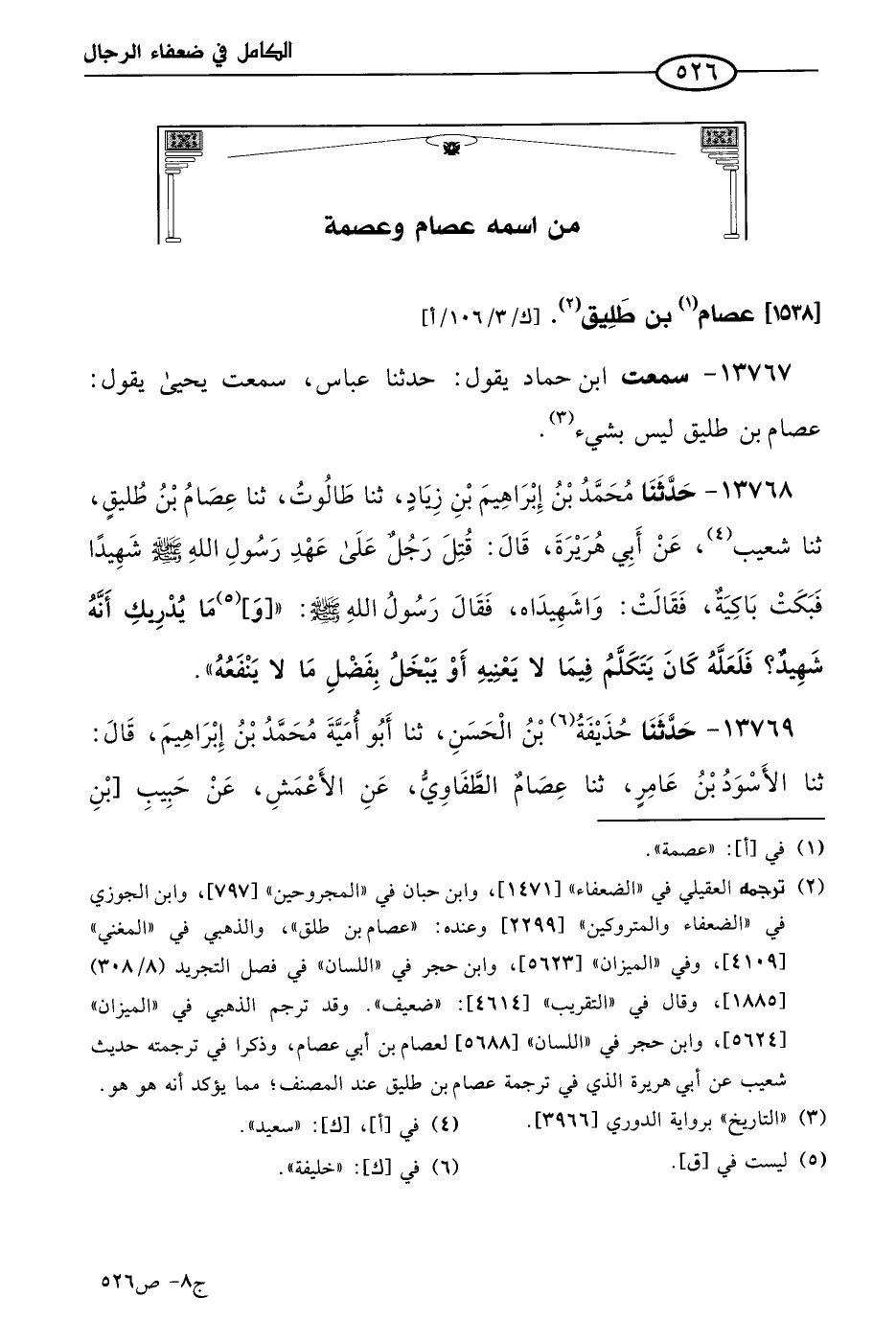 13767 - سمعتُ ابن حماد يقول: حَدثنا عباس، سمعت يَحيى يقول: عصام بن طليق ليس بشَيءٍ.