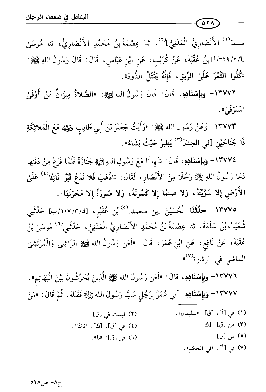 13775 - حَدثنا الحسين بن مُحمد بن عفير، حَدَّثني شُعَيب بن سلمة، حَدثنا عصمة بن مُحمد الأنصاري المدني، حَدَّثني موسى بن عقبة، عن نافع، عن ابن عُمر قال: لعن رسول الله صَلى الله عَليه وسَلم الراشي والمرتشي الماشي في الرشوة.