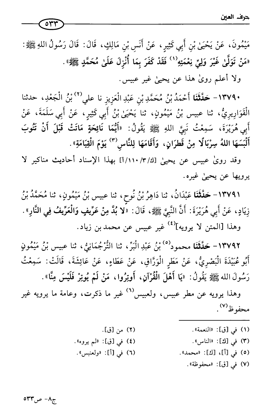 13791 - حَدثنا عبدان، حَدثنا داهر بن نوح، حَدثنا عبيس بن ميمون، حَدثنا مُحمد بن زياد، عن أبي هريرة؛ أن النبي صَلى الله عَليه وسَلم قال: لا بد من عريف، والعريف في النار.