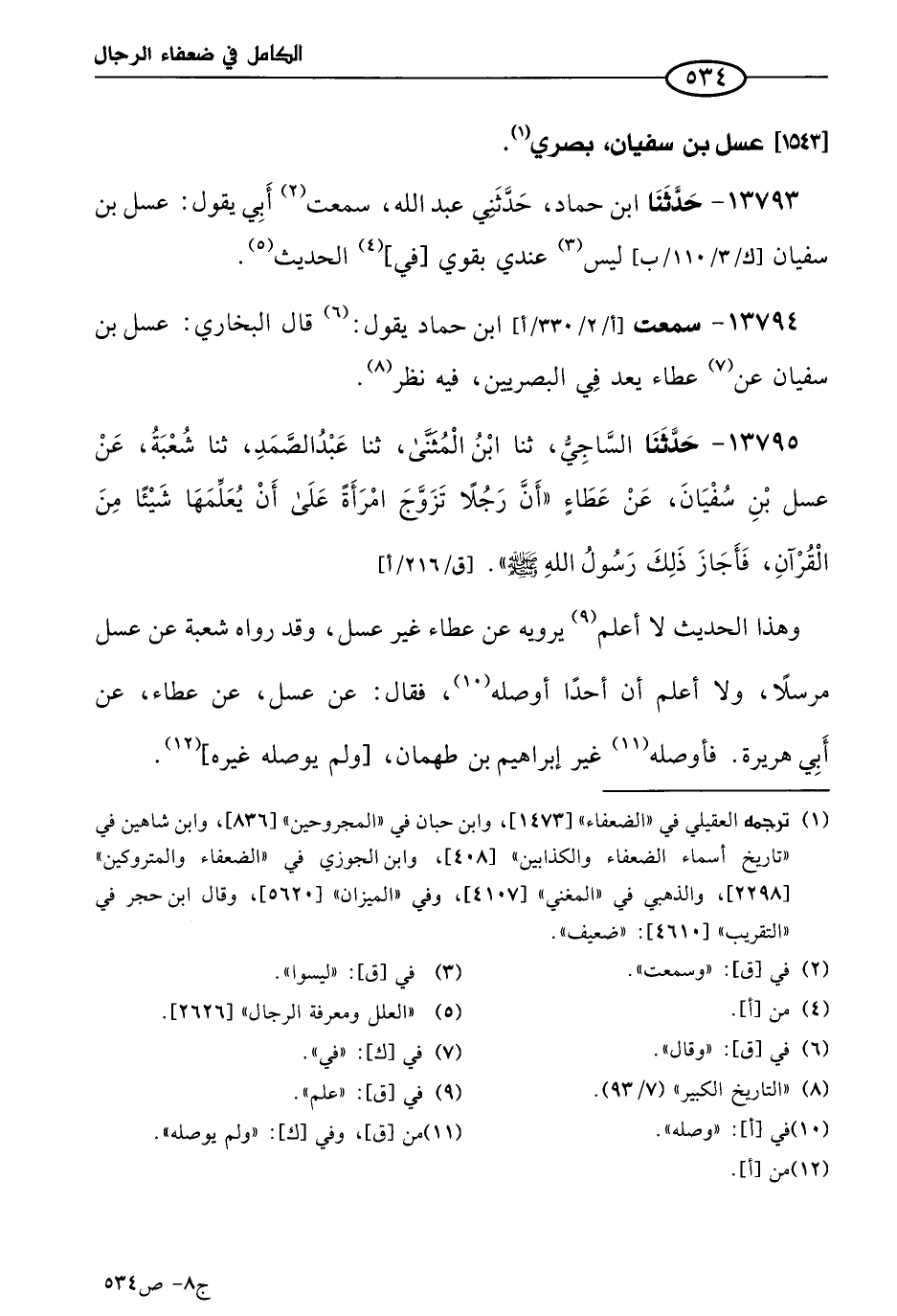 13794 - سمعتُ ابن حماد يقول: قال البُخاري: عسل بن سُفيان عن عطاء، يعد في البصريين، فيه نظر.