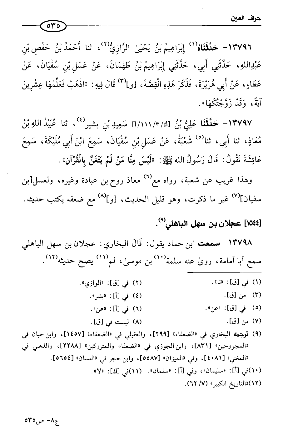 13798 - سمعتُ ابن حماد، يقول: قال البُخاري: عجلان بن سهل الباهلي، سمع أبا أمامة، روى عنه سلمة بن موسى، لم يصح حديثه.