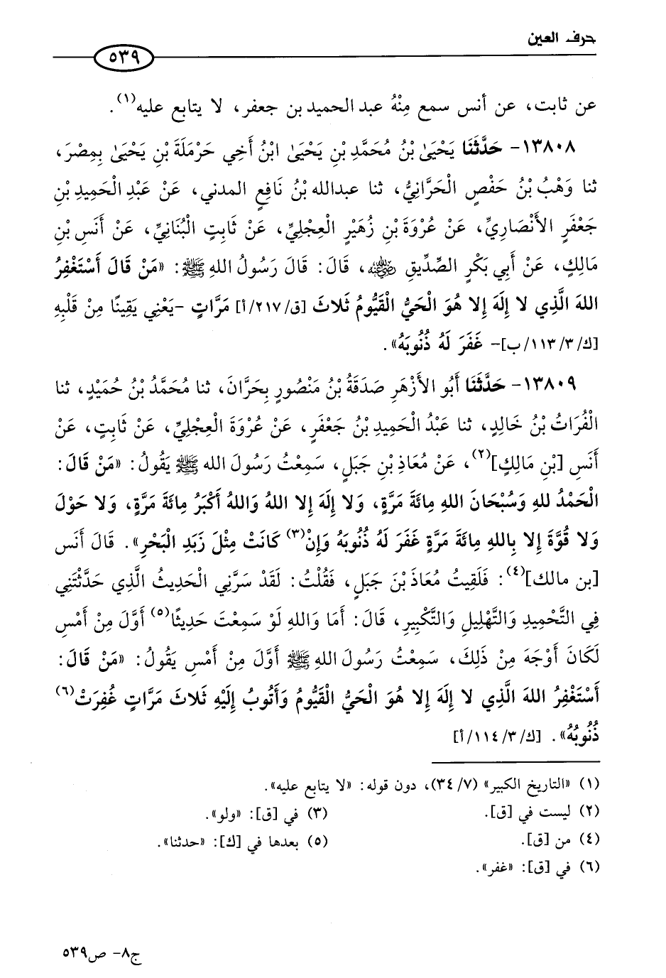 13809 - حَدثنا أَبو الأزهر صدقة بن منصور بحران، حَدثنا مُحمد بن حميد، حَدثنا الفرات بن خالد، حَدثنا عَبد الحميد بن جعفر، عن عروة العجلي، عن ثابت، عن أَنَس بن مالك، عن معاذ بن جبل، سمعت رسول الله صَلى الله عَليه وسَلم يقول: مَن قال: الحمد لله، وسبحان الله مِائَة مرة، ولا إله إلا الله، والله أكبر مِائَة مرة، ولا حول ولا قوة إلا بالله مِائَة مرة، غفر له ذنوبه وإن كانت مثل زبد البحر. قال أنس بن مالك: فلقيت معاذ بن جبل، فقلت: لقد سرني الحديث الذي حدثتني في التحميد والتهليل والتكبير، قال: أما والله لو سمعت حديثًا حدثنا أول من أمس لكان أوجه من ذلك، سمعت رسول الله صَلى الله عَليه وسَلم أول من أمس، يقول: مَن قال: أستغفر الله الذي لا إله إلا هو الحي القيوم وأتوب إليه ثلاث مرات، غفرت ذنوبه.