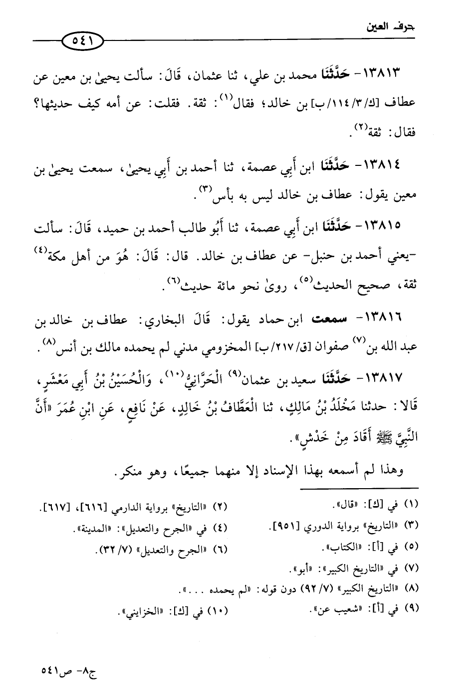 13814 - حَدثنا ابن أبي عصمة، حَدثنا أحمد بن أبي يَحيى، سمعت يَحيى بن مَعين يقول: عطاف بن خالد ليس به بأس.