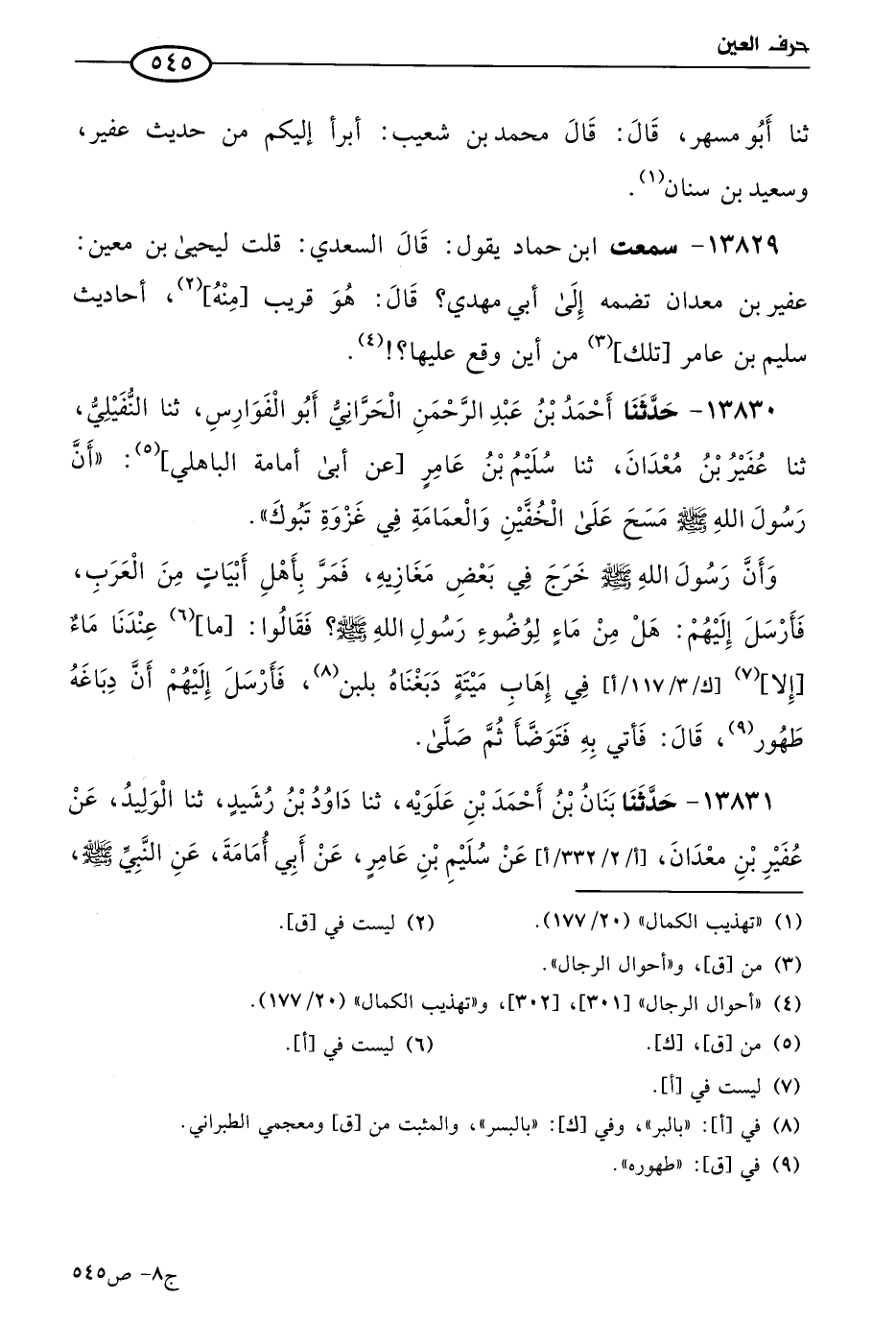 13830 - حَدثنا أحمد بن عَبد الرحمن الحراني أَبو الفوارس، حَدثنا النفيلي، حَدثنا عفير بن معدان، حَدثنا سليم بن عامر، عن أَبي أُمامة الباهلي؛ أن رسول الله صَلى الله عَليه وسَلم مسح على الخفين والعمامة في غزوة تبوك.