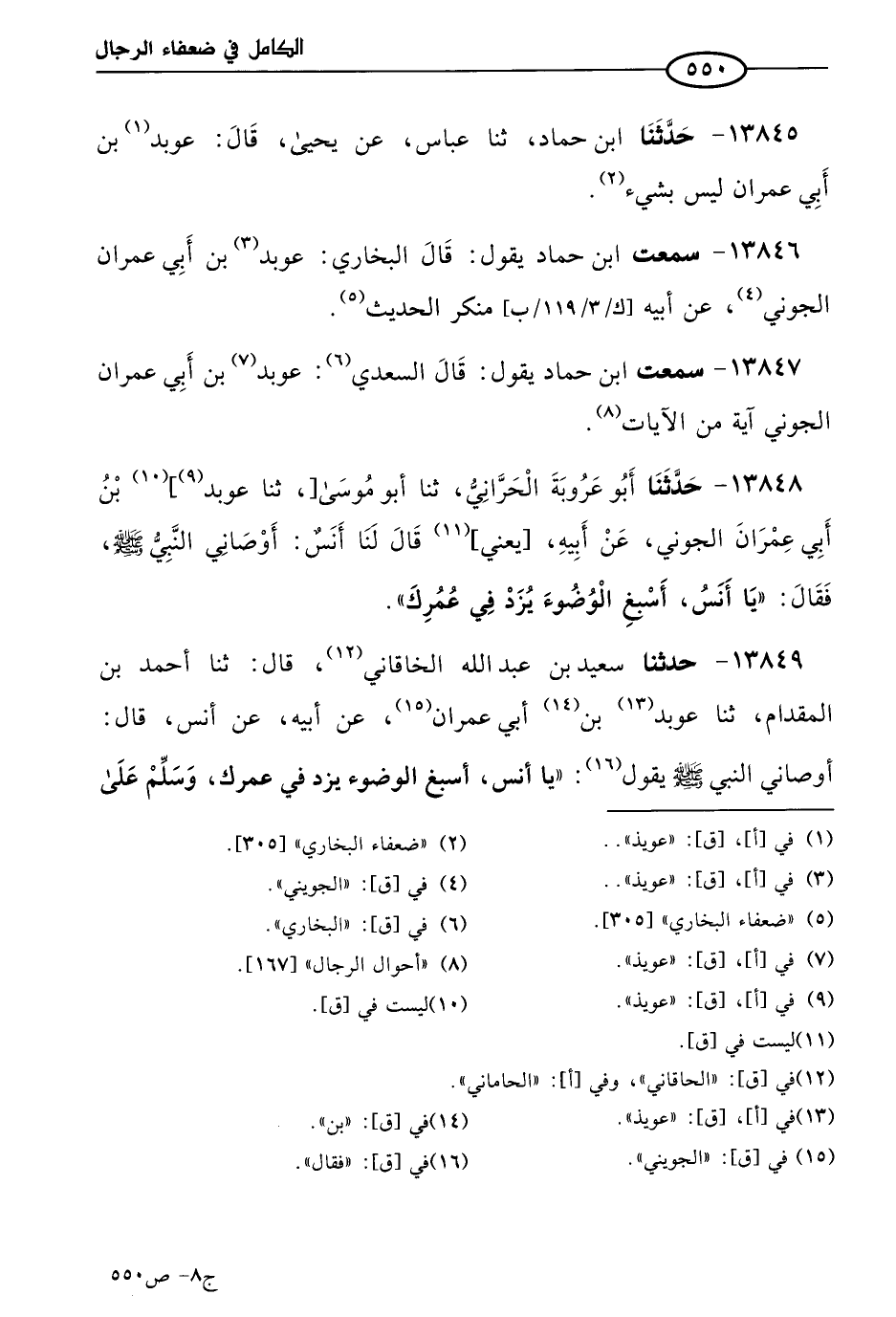 13846 - سمعتُ ابن حماد يقول: قال البُخاري: عَوبد بن أبي عمران الجوني عن أبيه، منكر الحديث.