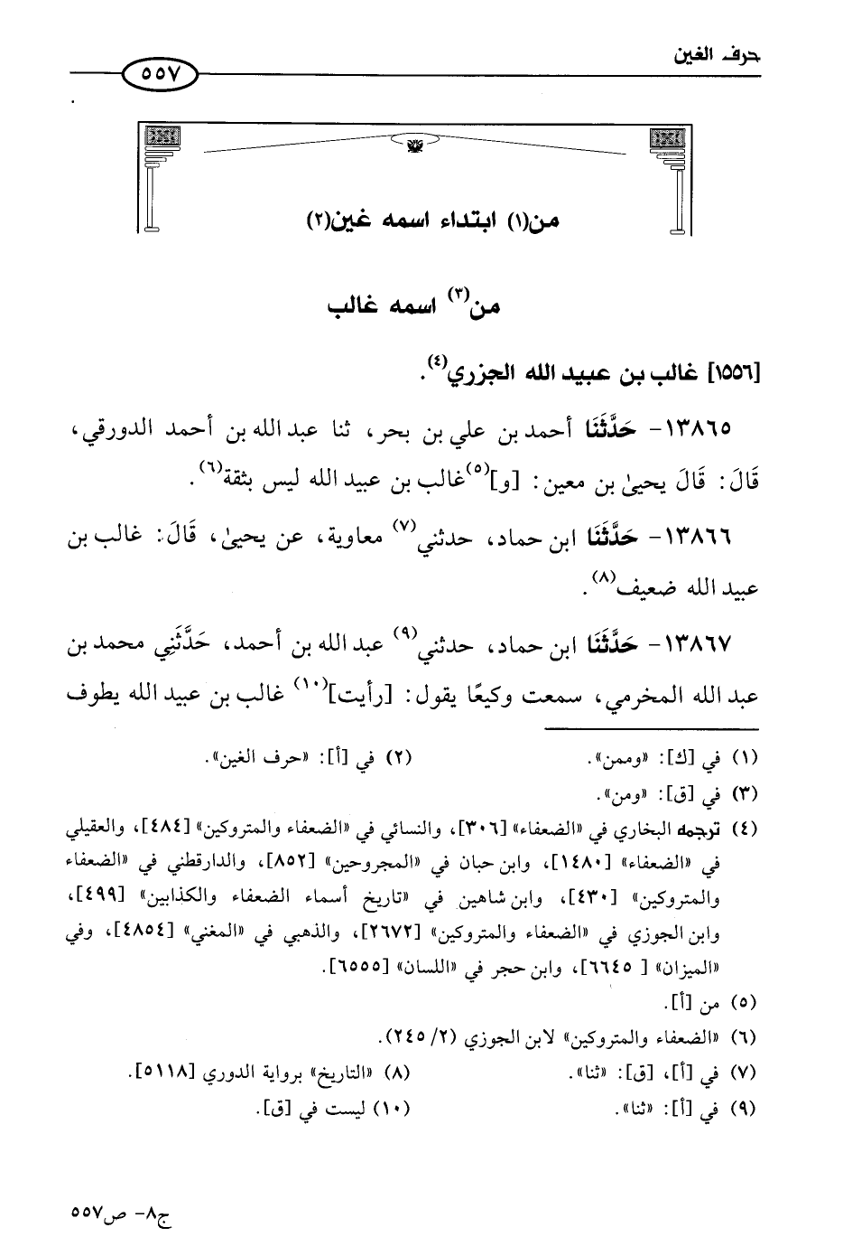 13865 - حَدثنا أحمد بن علي بن بحر، حَدثنا عَبد الله بن أحمد الدورقي، قال: قال يَحيى بن مَعين: وغالب بن عُبيد الله ليس بثقة.