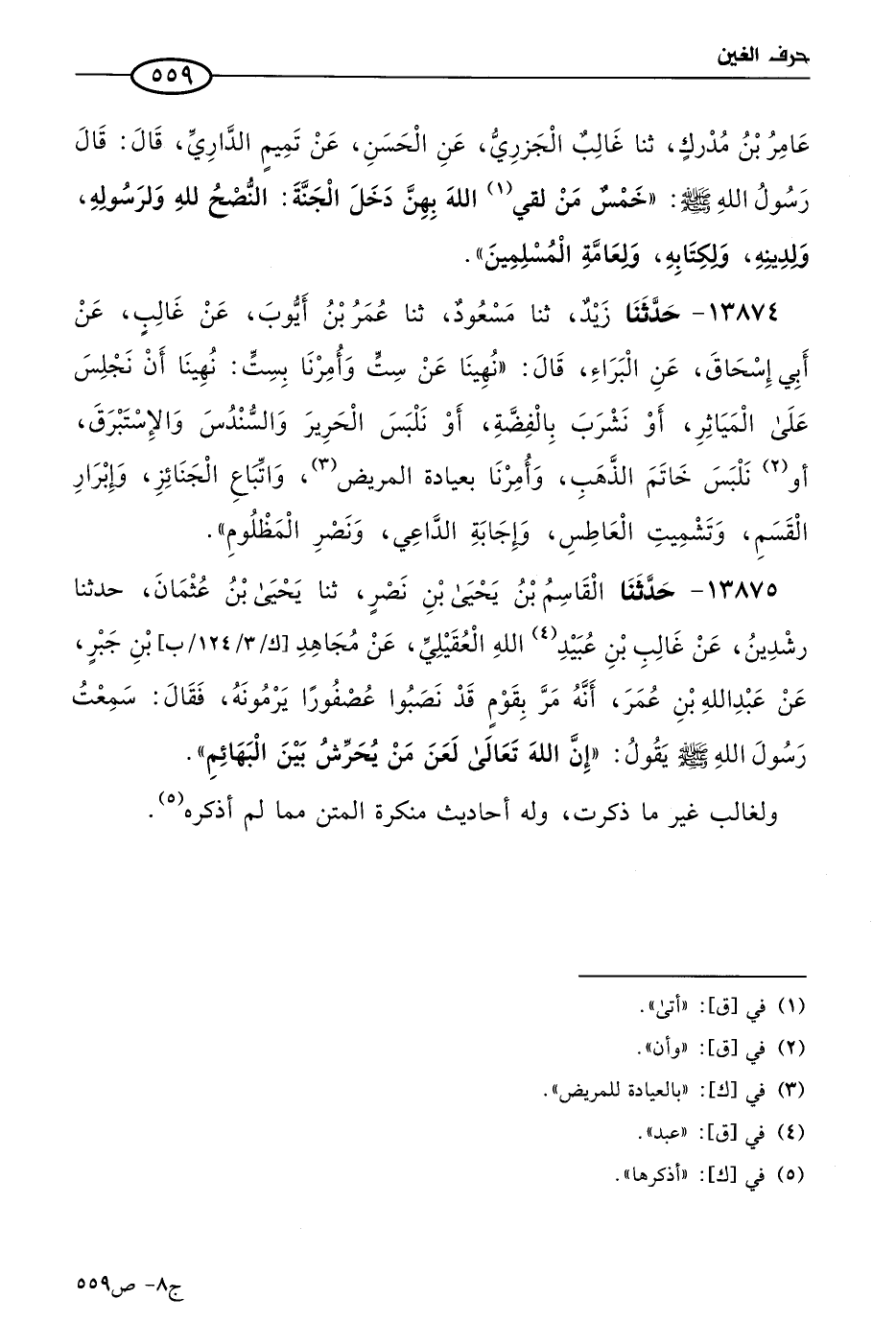 13875 - حَدثنا القاسم بن يَحيى بن نصر، حَدثنا يَحيى بن عثمان، حَدثنا رِشْدِين، عن غالب بن عُبيد الله العقيلي، عن مجاهد بن جبر، عن عَبد الله بن عُمر؛ أنه مر بقوم فد نصبوا عصفورا يرمونه، فقال: سمعتُ رسول الله صَلى الله عَليه وسَلم يقول: إن الله تعالى لعن من يحرش بين البهائم.
