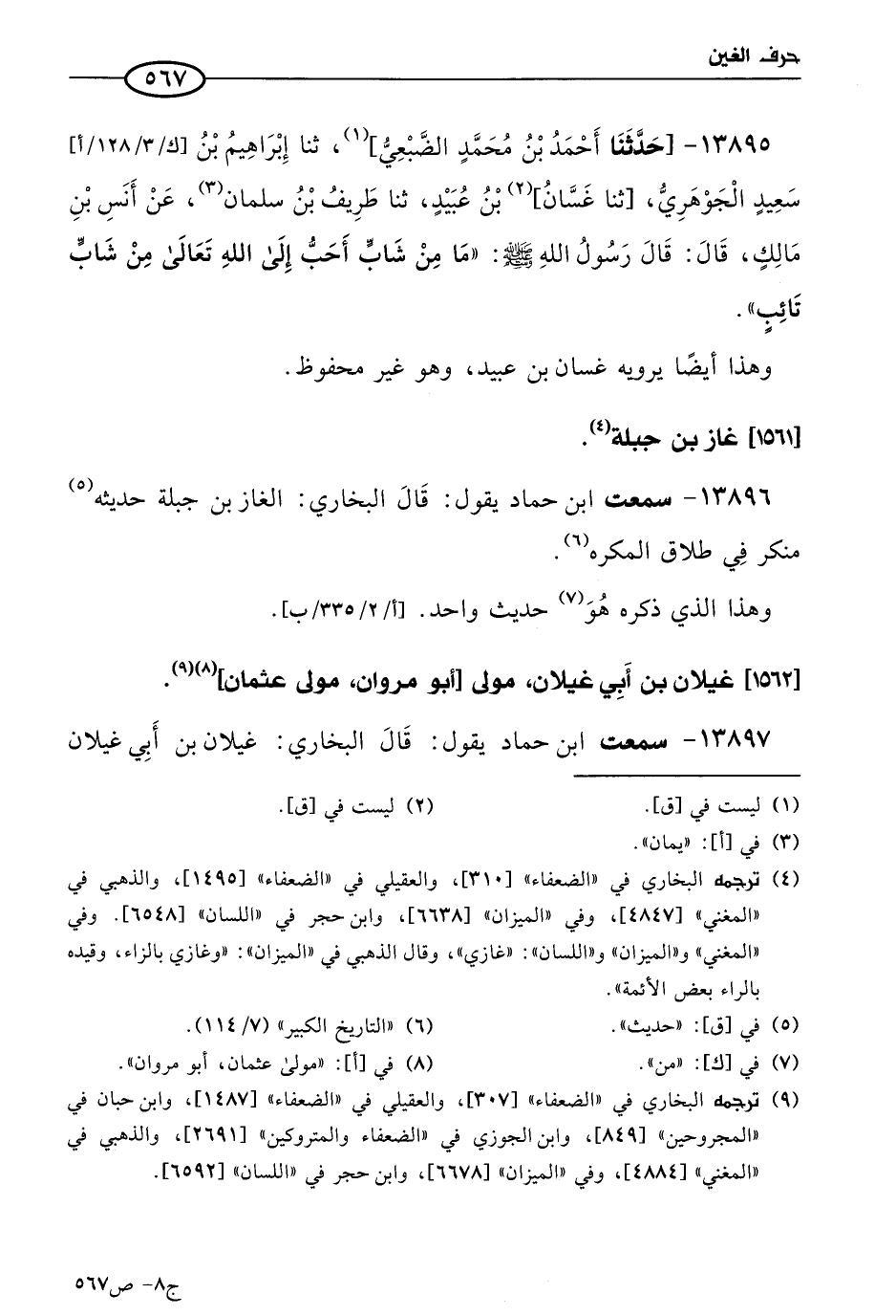 13897 - سمعتُ ابن حماد يقول: قال البُخاري: غيلان بن أبي غيلان أَبو مروان، مولى عثمان، روى عنه يعقوب بن عتبة، قال ابن عون: مررت بغيلان مصلوبا على باب الشام.