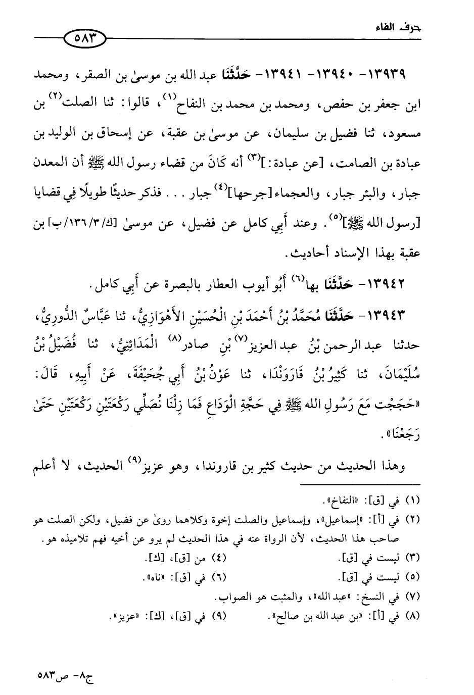 13941 - حَدثنا عَبد الله بن موسى بن الصقر، ومُحمد بن جعفر بن حفص، ومُحمد بن مُحمد بن النفاح، قالوا: حَدثنا الصلت بن مسعود، حَدثنا فضيل بن سليمان، عن موسى بن عقبة، عن إسحاق بن الوليد بن عبادة بن الصامت، عن عبادة؛ أنه كان من قضاء رسول الله صَلى الله عَليه وسَلم، أن المعدن جبار، والبئر جبار، والعجماء جرحها جبار. فذكر حديثًا طويلا في قضايا رسول الله صَلى الله عَليه وسَلم.