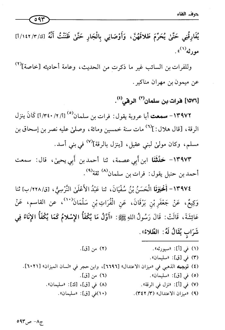 13973 - حَدثنا ابن أبي عصمة، حَدثنا أحمد بن أبي يَحيى، سمعت أحمد بن حنبل يقول: فرات بن سلمان ثقة.
