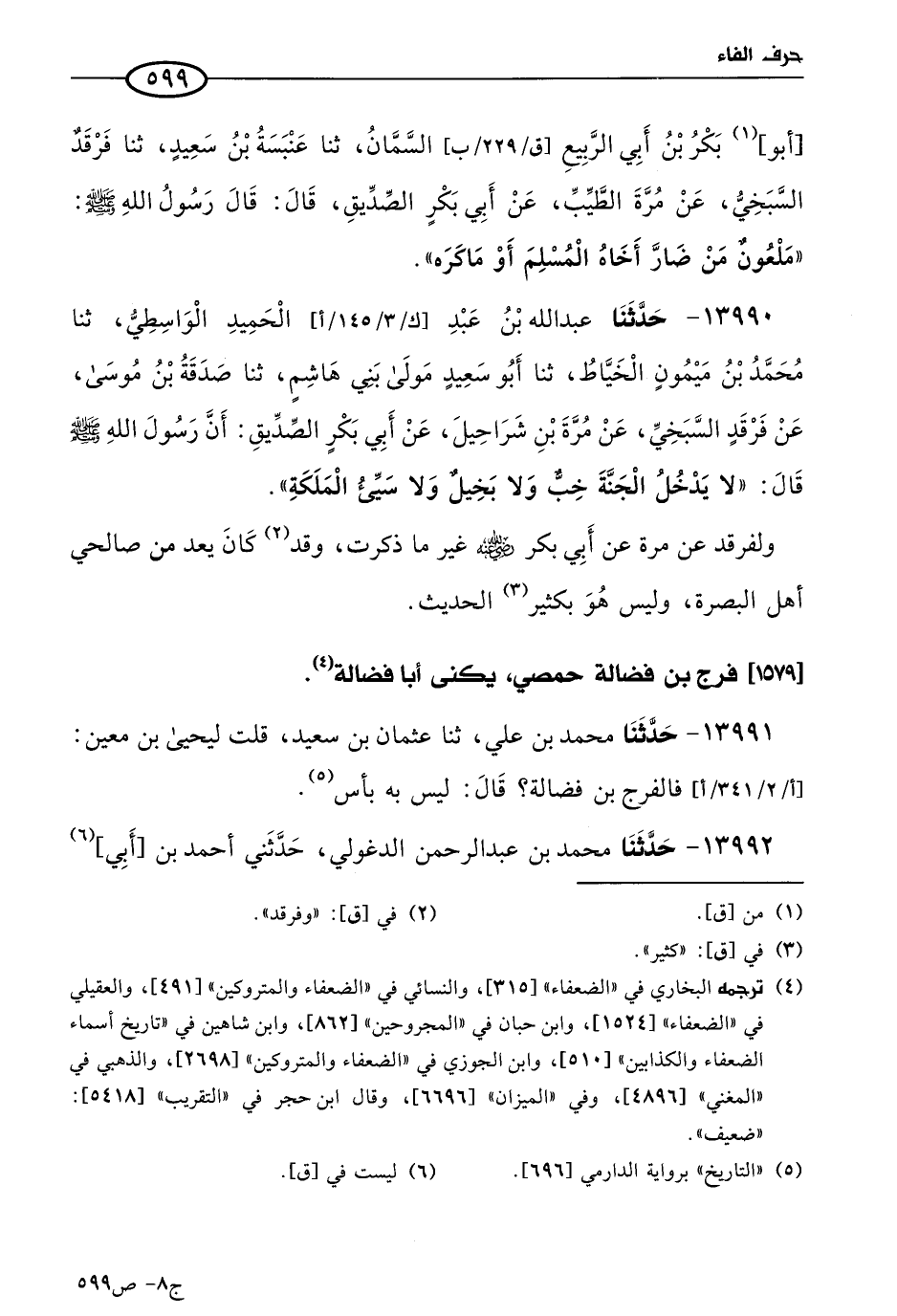13992 - حَدثنا مُحمد بن عَبد الرحمن الدغولي، حَدثني أحمد بن أبي زهير المروزي، أخبرنا النضر بن شميل، حَدثنا الفرج بن فضالة.