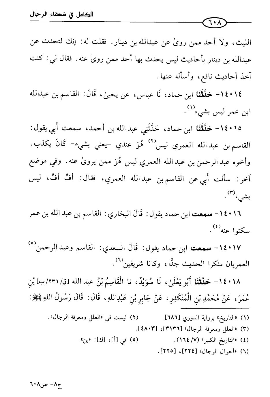 14017 - سمعتُ ابن حماد يقول: قال السعدي: القاسم، وعَبد الرحمن بن العمريان منكرا الحديث جدا، وكانا شريفين.