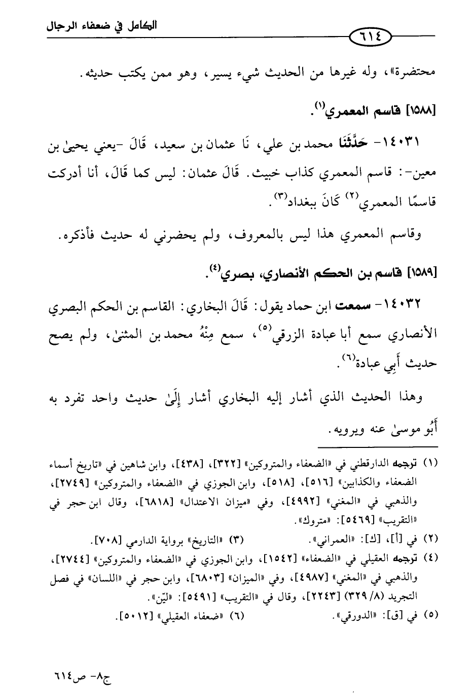 14031 - حَدثنا مُحمد بن علي، حَدثنا عثمان بن سعيد، قال، يعني يَحيى بن مَعين: قاسم المعمري كذاب خبيث. قال عثمان: ليس كما قال، أنا أدركت قاسما المعمري كان ببغداد.