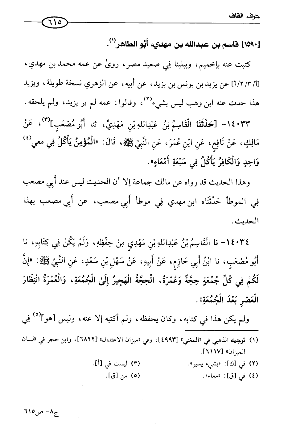 14033 - حَدثنا القاسم بن عَبد الله بن مهدي، حَدثنا أَبو مصعب، عن مالك، عن نافع، عن ابن عُمر، عن النبي صَلى الله عَليه وسَلم قال: المؤمن يأكل في معي واحد، والكافر يأكل في سبعة أمعاء.