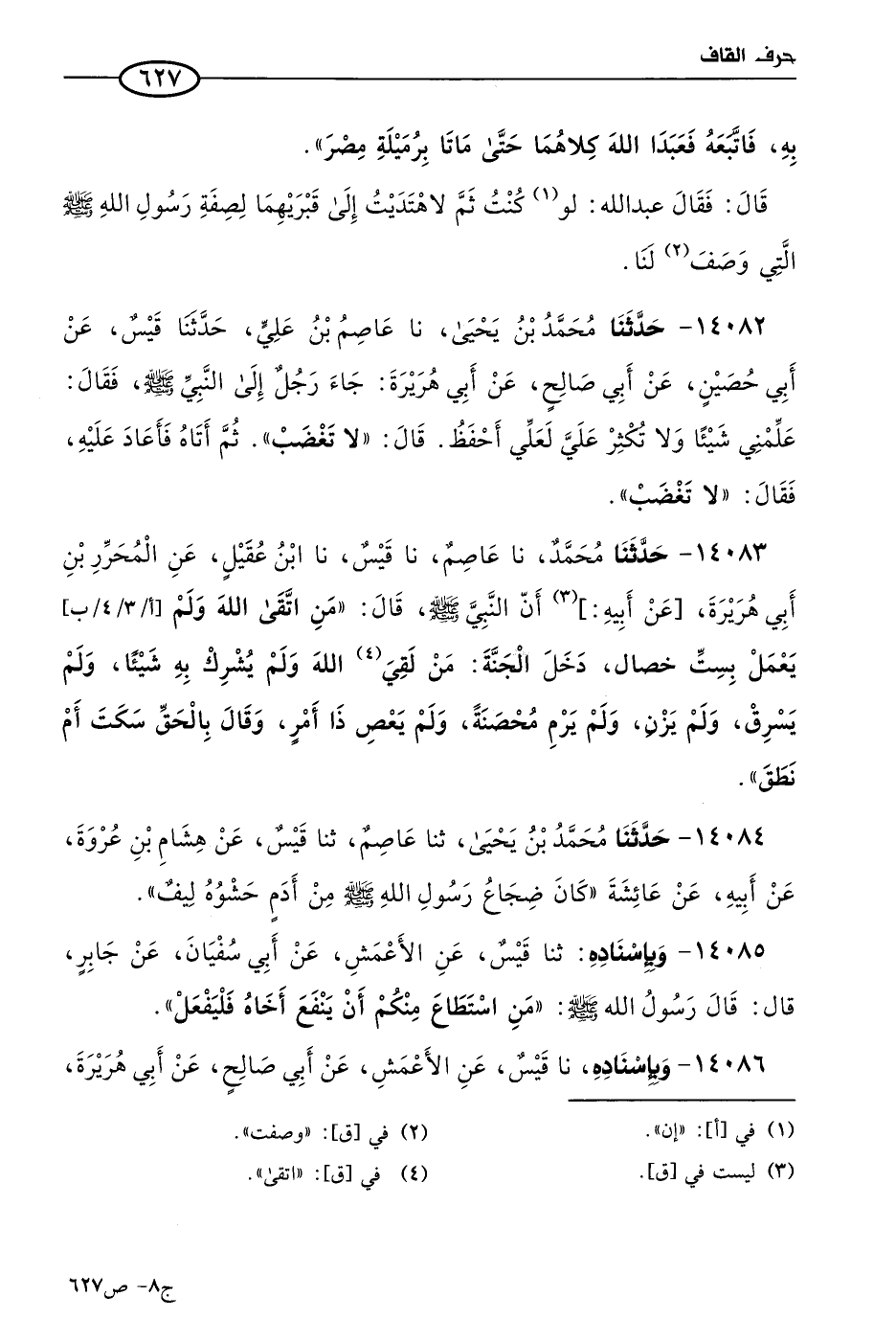 14082 - حَدثنا مُحمد بن يَحيى، حَدثنا عاصم بن علي، حَدثنا قيس، عن أبي حصين، عن أبي صالح، عن أبي هريرة؛ جاء رجل إلى النبي صَلى الله عَليه وسلم فقال: علمني شيئا ولا تكثر عليَّ، لعلي أحفظ، قال: لا تغضب، ثم أتاه فأعاد عليه، فقال: لا تغضب.