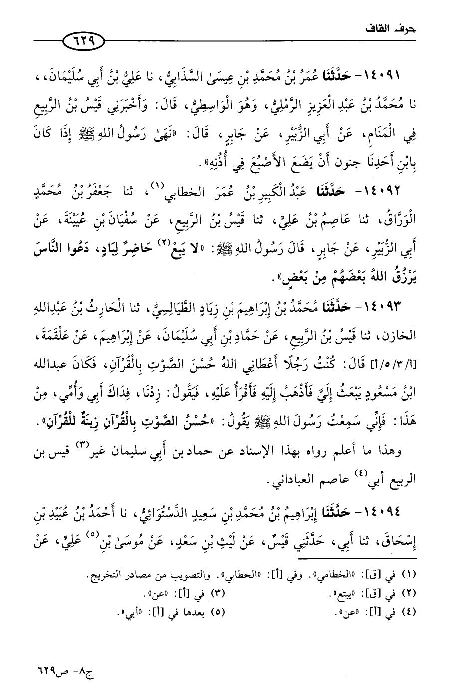 14093 - حَدثنا مُحمد بن إبراهيم بن زياد الطيالسي، حَدثنا الحارث بن عَبد الله الخازن، حَدثنا قيس بن الربيع، عن حماد بن أبي سليمان، عن إبراهيم، عن علقمة، قال: كنتُ رجلاً أعطاني الله حسن الصوت بالقرآن، فكان عَبد الله بن مسعود يبعث إلي فأذهب إليه فأقرأ عليه، فيقول: زدنا، فداك أبي وأمي، مِن هذا، فإني سمعت رسول الله صَلى الله عَليه وسَلم يقول: حسن الصوت بالقرآن زينة للقرآن.