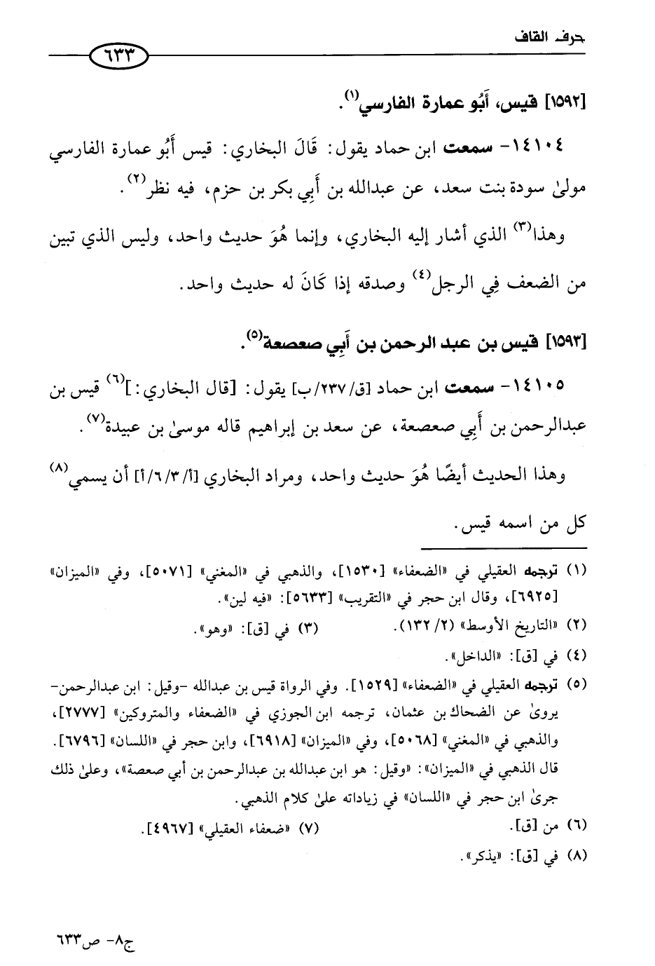 14104 - سمعتُ ابن حماد يقول: قال البُخاري: قيس أَبو عمارة الفارسي، مولى سودة بنت سعد، عن عَبد الله بن أبي بكر بن حزم، فيه نظر.