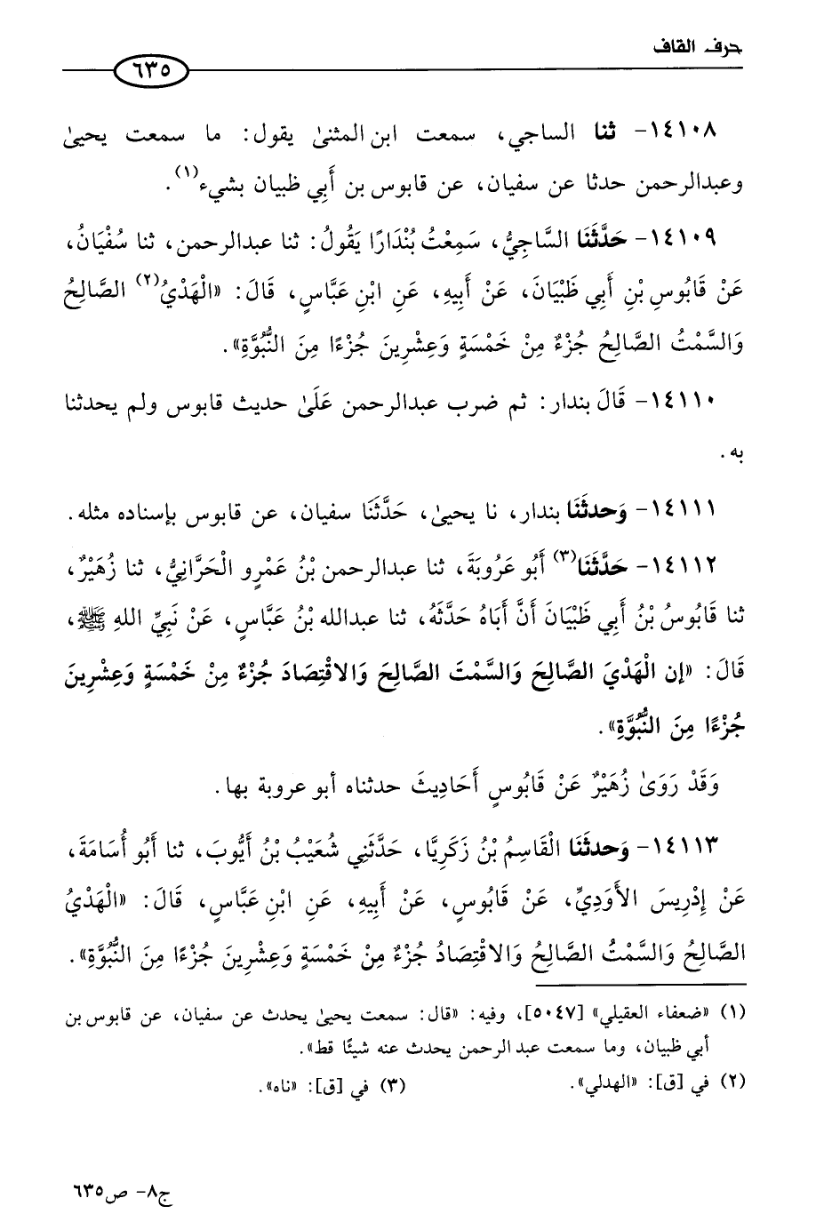 14109 - حَدثنا الساجي، سمعت بُنْدَارا يقول: حَدثنا عَبد الرحمن، حَدثنا سُفيان، عن قابوس بن أبي ظبيان، عن أبيه، عن ابن عباس قال: الهدي الصالح، والسمت الصالح، جزء من خمسة وعشرين جزءًا من النبوة.