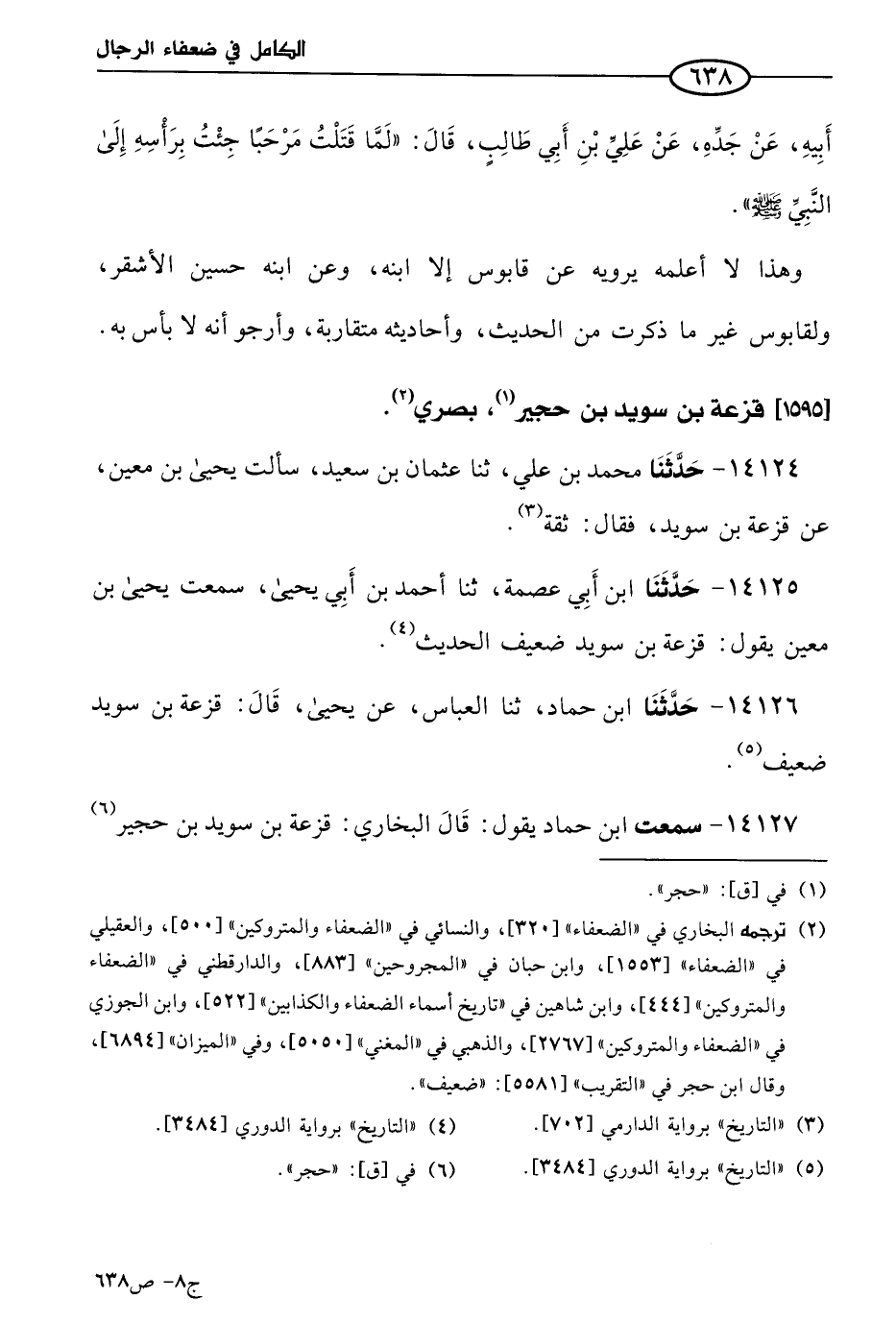 14126 - حَدثنا ابن حماد، حَدثنا العباس، عن يَحيى، قال: قزعة بن سويد ضعيف.