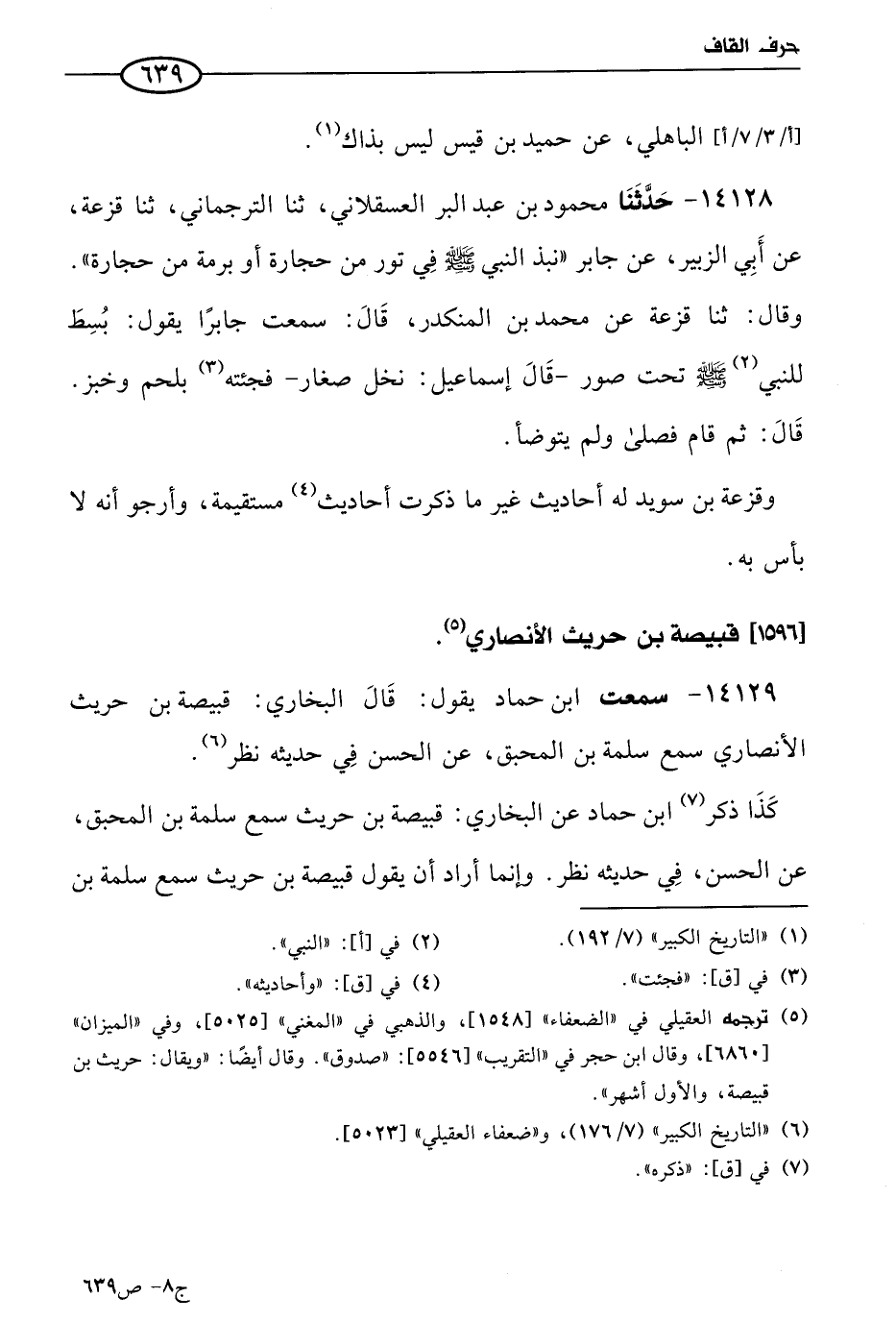 14129 - سمعتُ ابن حماد يقول: قال البُخاري: قبيصة من حريث الأنصاري، سمع سلمة بن المُحَبِّق عن الحسن، في حديثه نظر.