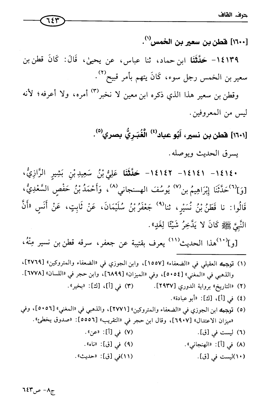 14139 - حَدثنا ابن حماد، حَدثنا عباس، عن يَحيى، قال: كان قطن بن سعير بن الخمس رجل سوء، كان يتهم بأمر قبيح.