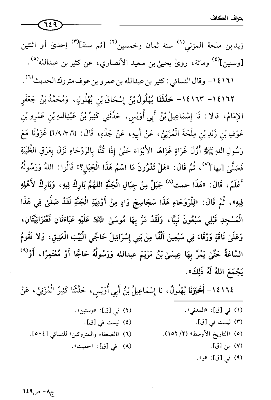14162 - 14163 - حَدثنا بهلول بن إسحاق بن بهلول، ومُحمد بن جعفر بن (1) الإمام، قالا: حَدثنا إسماعيل بن أبي أويس، حَدَّثني كثير بن عَبد الله بن عَمرو عوف بن زيد بن ملحة المزني، عن أبيه، عن جَدِّه قال: غزونا مع رسول الله صَلى الله عَليه وسَلم أول غزاة غزاها الأبواء، حتى إذا كنا بالروحاء نزل بعرق الظبية، فصلى بها، ثم قال: هل تدرون ما اسم هذا الجبل؟ قالوا: الله ورسوله أعلم، قال: هذا حمت، جبل من جبال الجنة، اللهم بارك فيه، وبارك لأهله فيه، ثم قال للروحاء: هذا سجاسج، واد من أودية الجنة، لقد صلى في هذا المسجد قبلي سبعون نبيا، ولقد مر بها موسى عليه السلام عليه عباءتان قطوانيتان، وعلى ناقة ورقاء، في سبعين ألفا من بني إسرائيل، حاجّي البيت العتيق، ولا تقوم الساعة حتى يمر بها عيسى بن مريم، عَبد الله ورسوله، حاجا أو معتمرا، أو يجمع الله له ذلك.