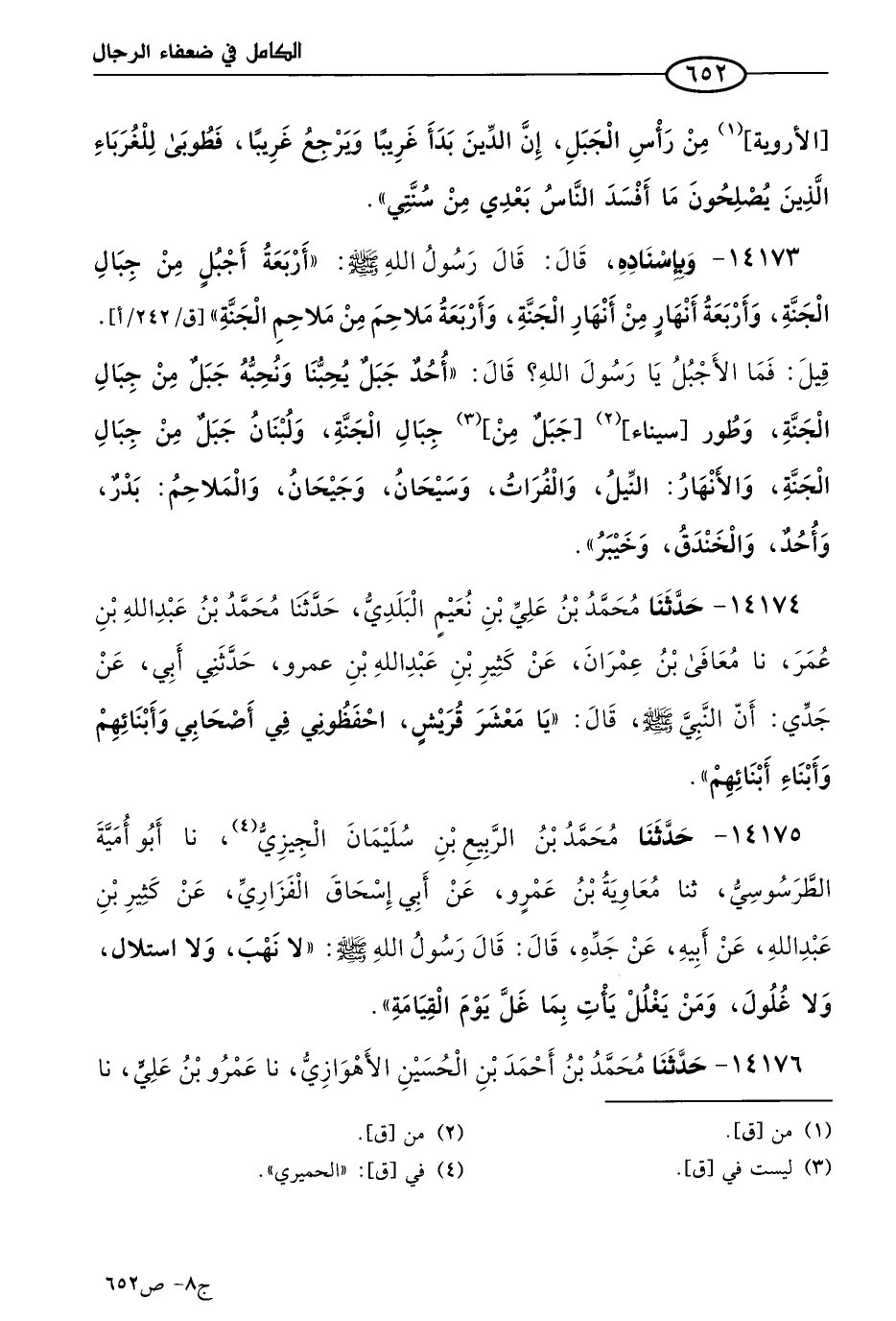14173 - وبإسناده؛ قال: قال رسول الله صَلى الله عَليه وسَلم: أربعة أجبل من جبال الجنة، وأربعة أنهار من أنهار الجنة، وأربعة ملاحم من ملاحم الجنة، قيل: فما الأجبل يا رسول الله؟ قال: أُحد جبل يحبنا ونحبه جبل من جبال الجنة، وطور سيناء جبل من جبال الجنة، ولبنان جبل من جبال الجنة، والأنهار: النيل والفرات، وسيحان وجيحان، والملاحم: بدر وأحد، والخندق وخيبر.