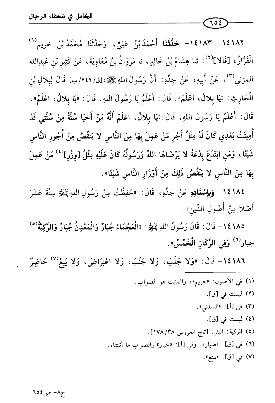 14182 - 14183 - حَدثنا أحمد بن علي، وحدثنا مُحمد بن خريم القزاز، قالا: حَدثنا هشام بن خالد، حَدثنا مروان بن معاوية، عن كثير بن عَبد الله المزني، عن أبيه، عن جَدِّهِ؛ أن رسول الله صَلى الله عَليه وسَلم قال لبلال بن الحارث: يا بلال، اعلم، قال: أعلم، يا رسول الله، قال: يا بلال، اعلم، قال: أعلم، يا رسول الله، قال: يا بلال، اعلم أنه من أحيا سنة من سنتي قد أميتت بعدي، كان له مثل أجر من عمل بها من الناس، لا ينقص من أجور الناس شيئا، ومن ابتدع بدعة لا يرضاها الله ورسوله، كان عليه مثل وزر من عمل بها من الناس، لا ينقص ذلك من أوزار الناس شَيئًا.