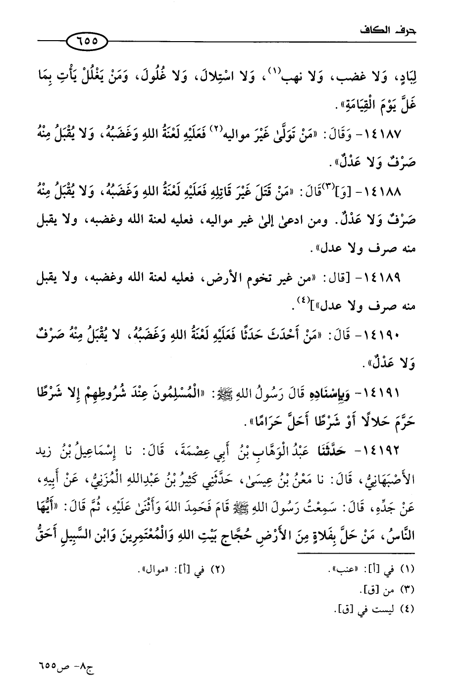 14188 - وقال: من قتل غير قاتله، فعليه لعنة الله وغضبه، ولا يقبل منه صرف، ولا عدل. ومن ادعى إلى غير مواليه فعليه لعنة الله وغضبه، ولا يقبل منه صرف، ولا عدل.