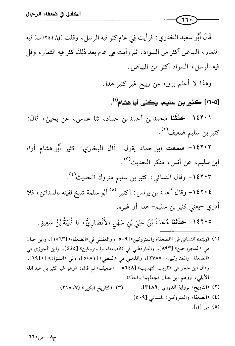 14202 - سمعتُ ابن حماد يقول: قال البُخاري: كثير أَبو هشام، أراه ابن سليم، عن أَنَس، منكر الحديث.