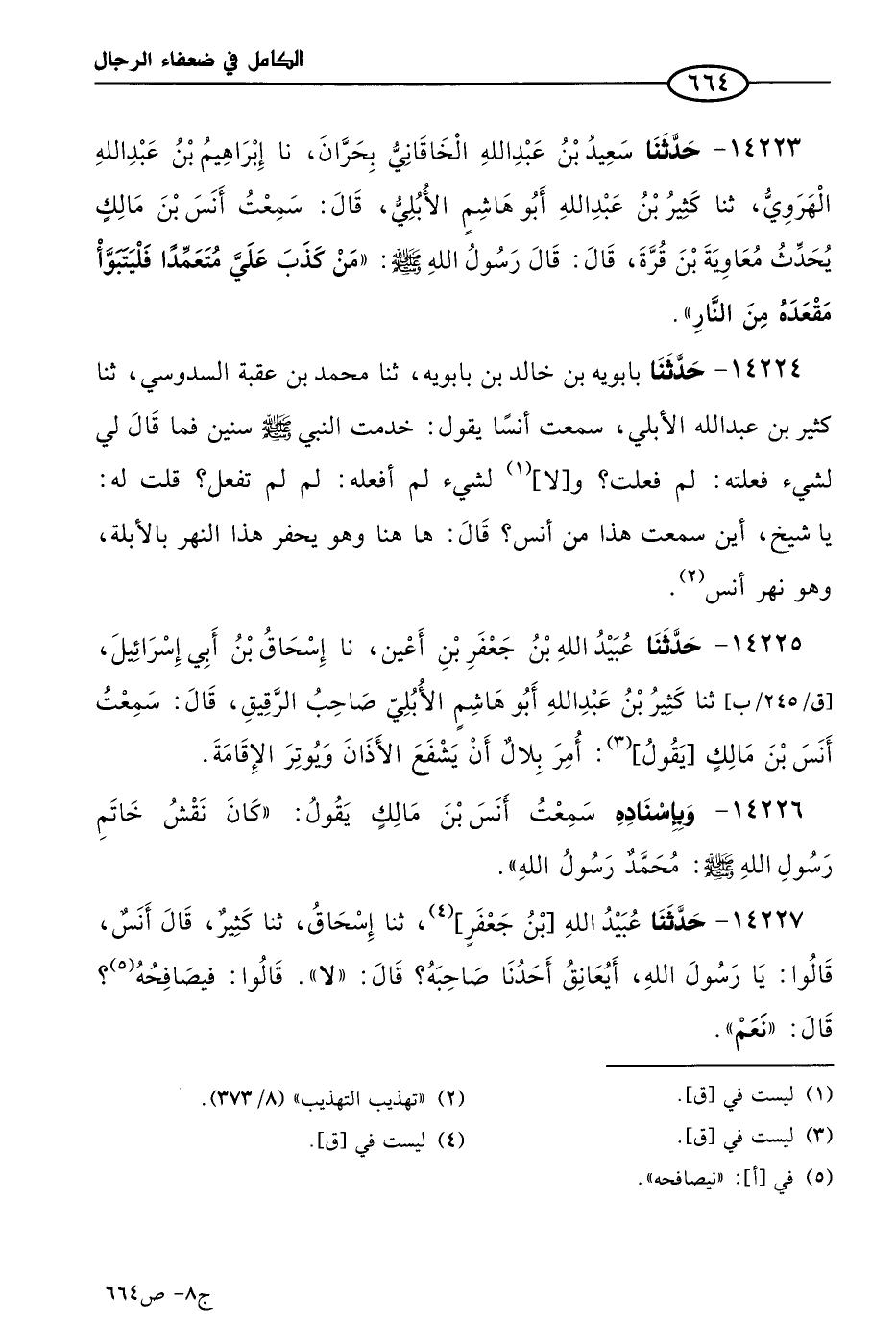 14223 - حَدثنا سعيد بن عَبد الله الخاقاني بحران، حَدثنا إبراهيم بن عَبد الله الهروي، حَدثنا كثير بن عَبد الله أَبو هاشم الأبلي، قال: سمعتُ أنس بن مالك، يحدث معاوية بن قرة، قال: قال رسول الله صَلى الله عَليه وسَلم: من كذب علي متعمدا، فليتبوأ مقعده من النار.