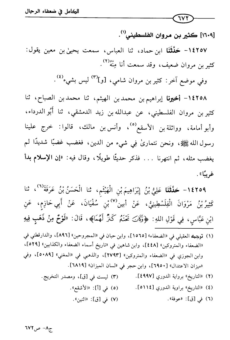14257 - حَدثنا ابن حماد، حَدثنا العباس، سمعت يَحيى بن مَعين يقول: كثير بن مروان ضعيف، وقد سمعت أنا منه.
