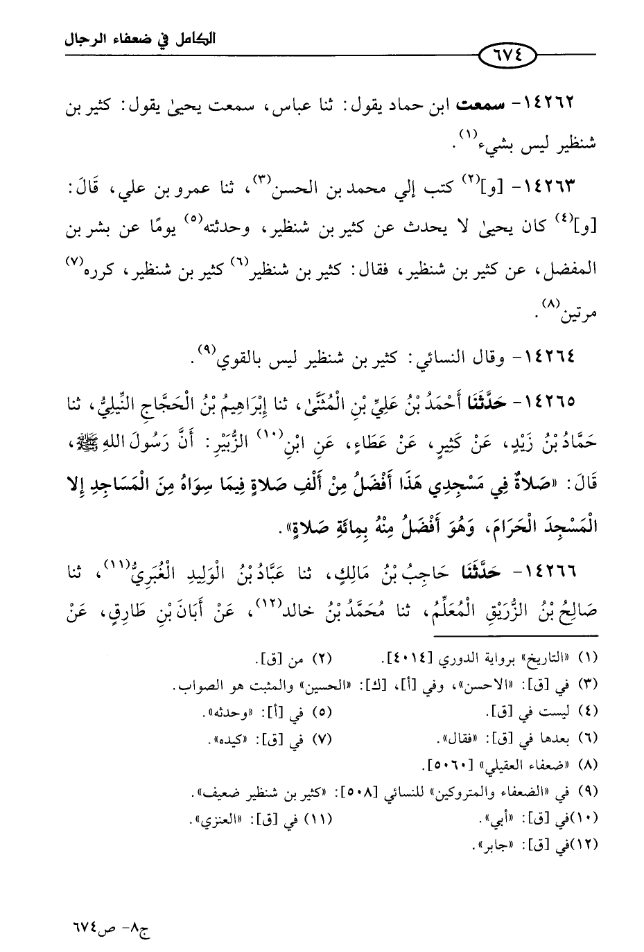 14262 - سمعتُ ابن حماد يقول: حَدثنا عباس، سمعت يَحيى يقول: كثير بن شنظير ليس بشَيءٍ.