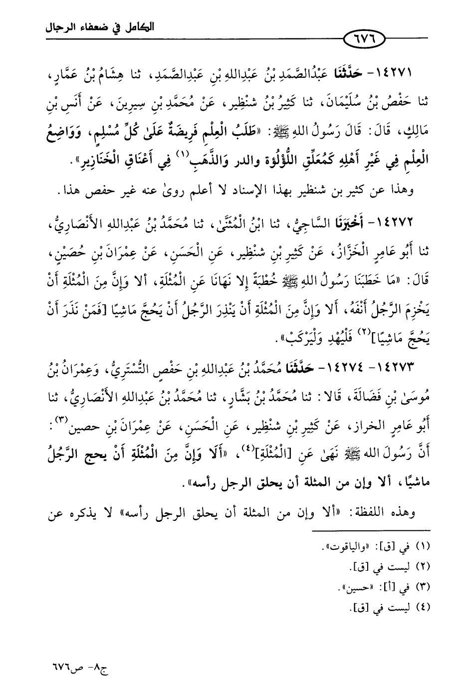 14273 - 14274 - حَدثنا مُحمد بن عَبد الله بن حفص التستري، وعمران بن موسى بن فضالة، قالا: حَدثنا مُحمد بن بشار، حَدثنا مُحمد بن عَبد الله الأنصاري، حَدثنا أَبو عامر الخزاز، عن كثير بن شنظير، عن الحسن، عن عمران بن حصين؛ أن رسول الله صَلى الله عَليه وسَلم نهى عن المثلة، ألاّ وإن من المثلة أن يحج الرجل ماشيا، ألا وإن من المثلة أن يحلق الرجل رأسه.
