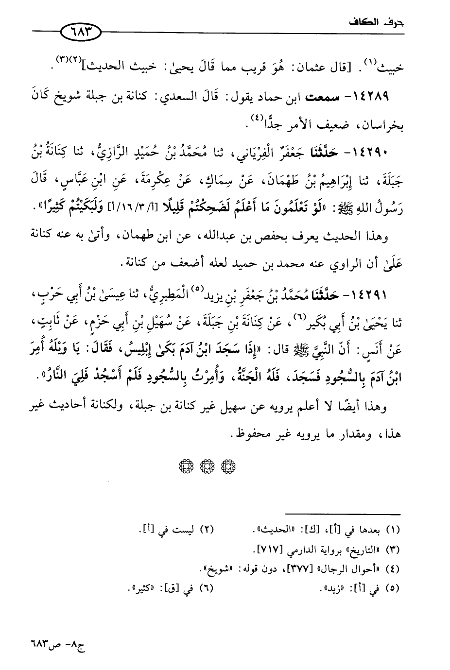 14290 - حَدثنا جعفر الفريابي (1)، حَدثنا مُحمد بن حميد الرازي، حَدثنا كنانة بن جبلة، حَدثنا إبراهيم بن طهمان، عن سماك، عن عِكرمَة، عن ابن عباس، قال رسول الله صَلى الله عَليه وسَلم: لو تعلمون ما أعلم، لضحكتم قليلا، ولبكيتم كثيرا.